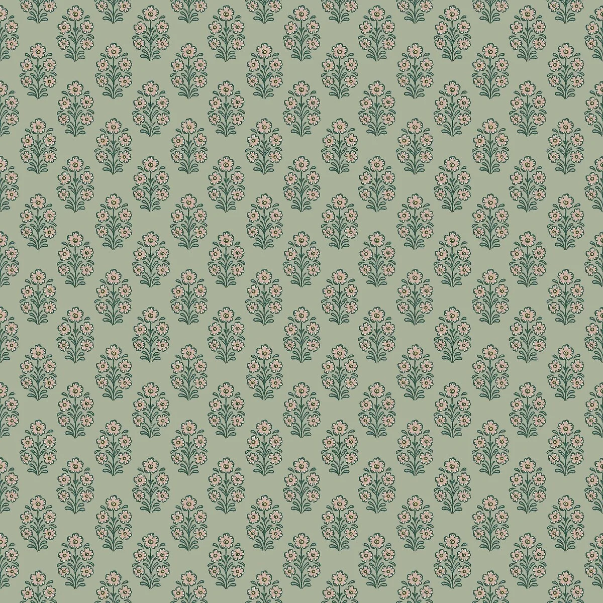 Na ścianie widać drobne, powtarzalne bukiety kwiatów rozmieszczone w regularnym układzie. Kompaktowy wzór wprowadza dekorację, ale nie przytłacza wnętrza, dlatego tapeta dobrze sprawdza się również na większych powierzchniach ścian.