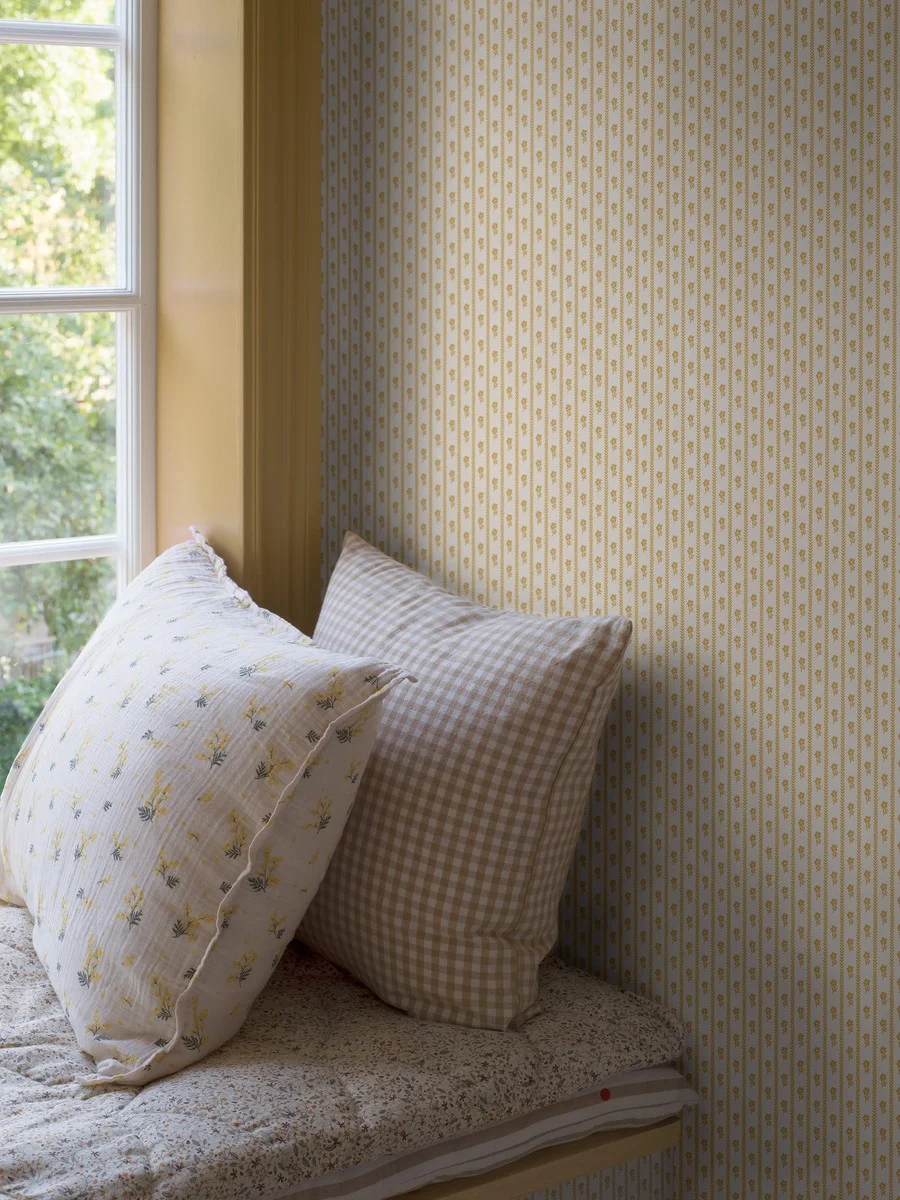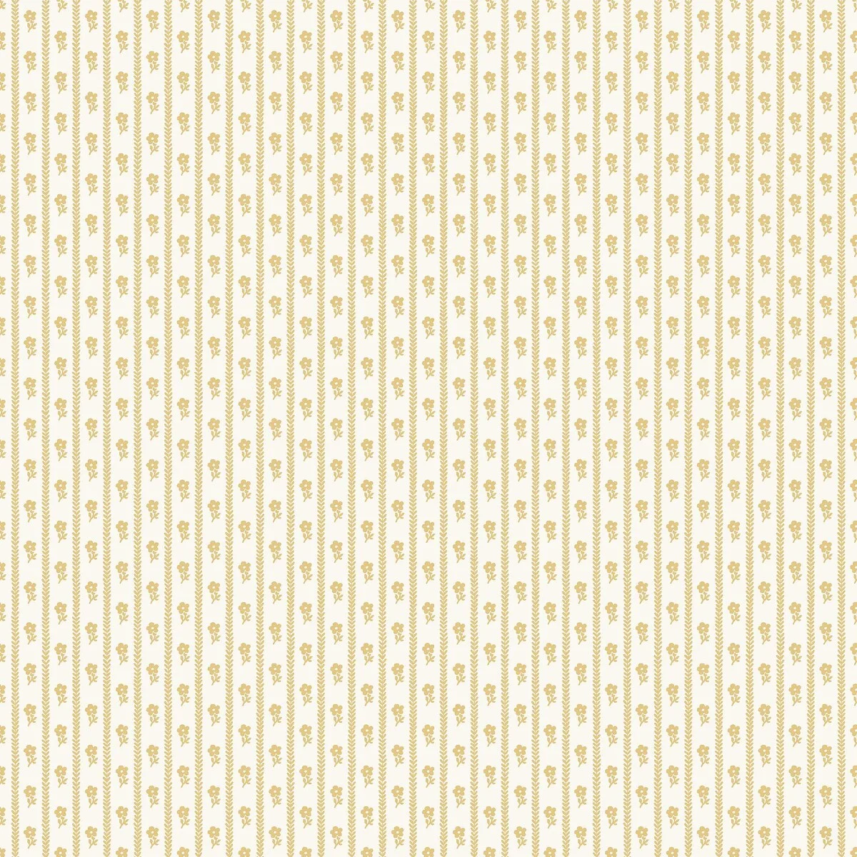 Tapeta 6953 Lilla Lyckan Boråstapeter przedstawia drobny, regularny wzór małych kwiatów i liści w pionowych układach na jasnym, żółtym tle. Motyw jest subtelny i uporządkowany, dzięki czemu ściana wygląda estetycznie, bez efektu chaosu.
