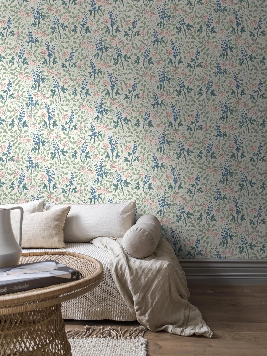Sprawdzi się jako tapeta na ściany w salonie, sypialni, pokoju dziecka lub przedpokoju. Jasne tło odbija światło, a kolorowe kwiaty i liście wprowadzają przyjemny, uporządkowany charakter wnętrza.