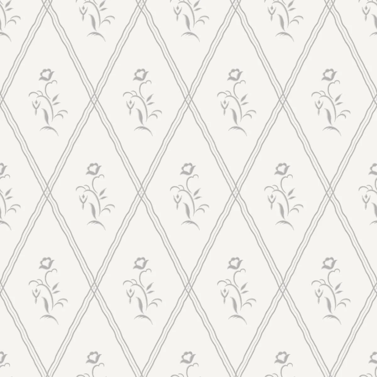 Tapeta Signe 5507 marki Boråstapeter pochodzi z kolekcji Swedish Grace. Wzór łączy geometryczną kratkę trellis z drobnymi kwiatami, które pojawiają się w punktach przecięcia linii. Dzięki temu powstaje lekka kompozycja łącząca motyw roślinny z geometrią.
