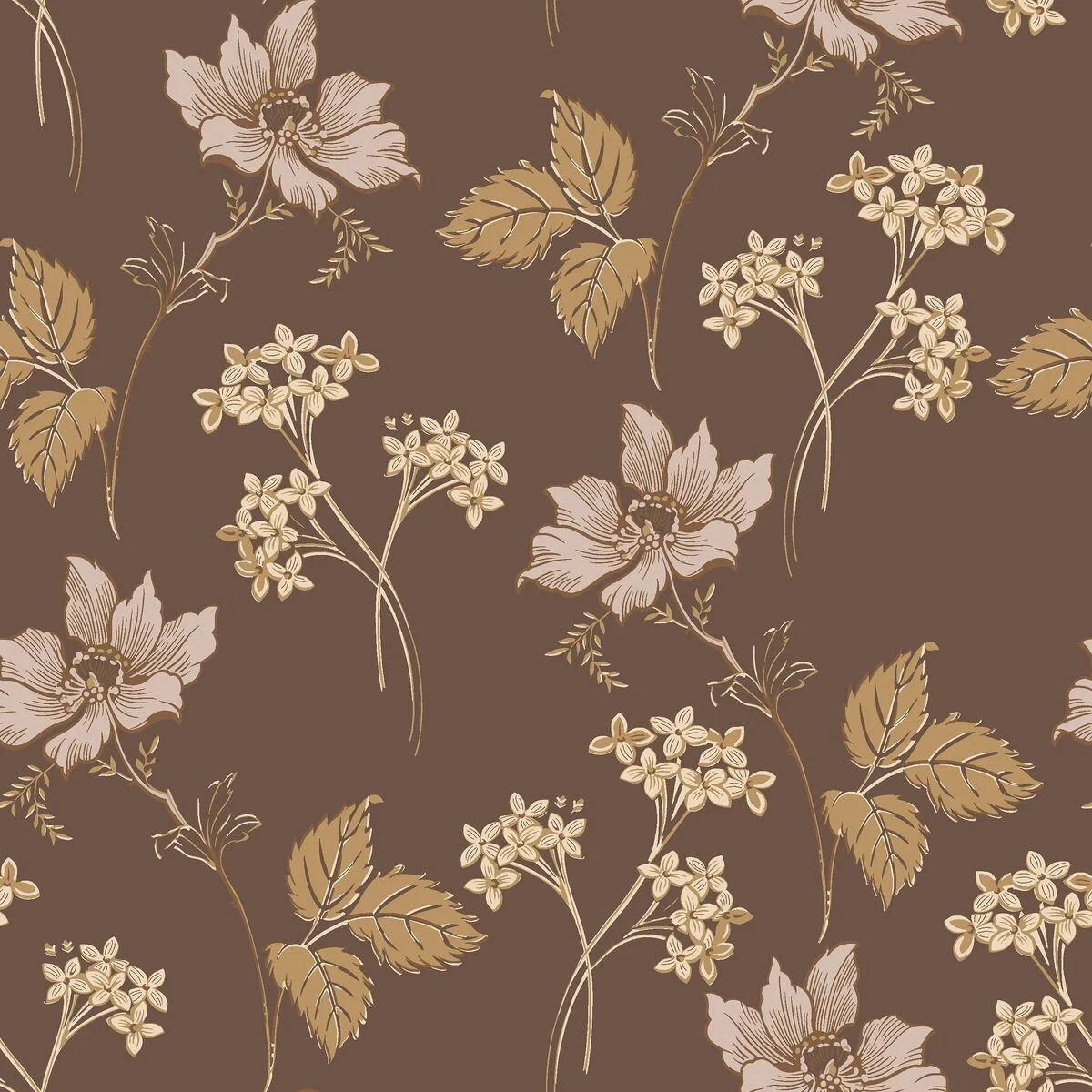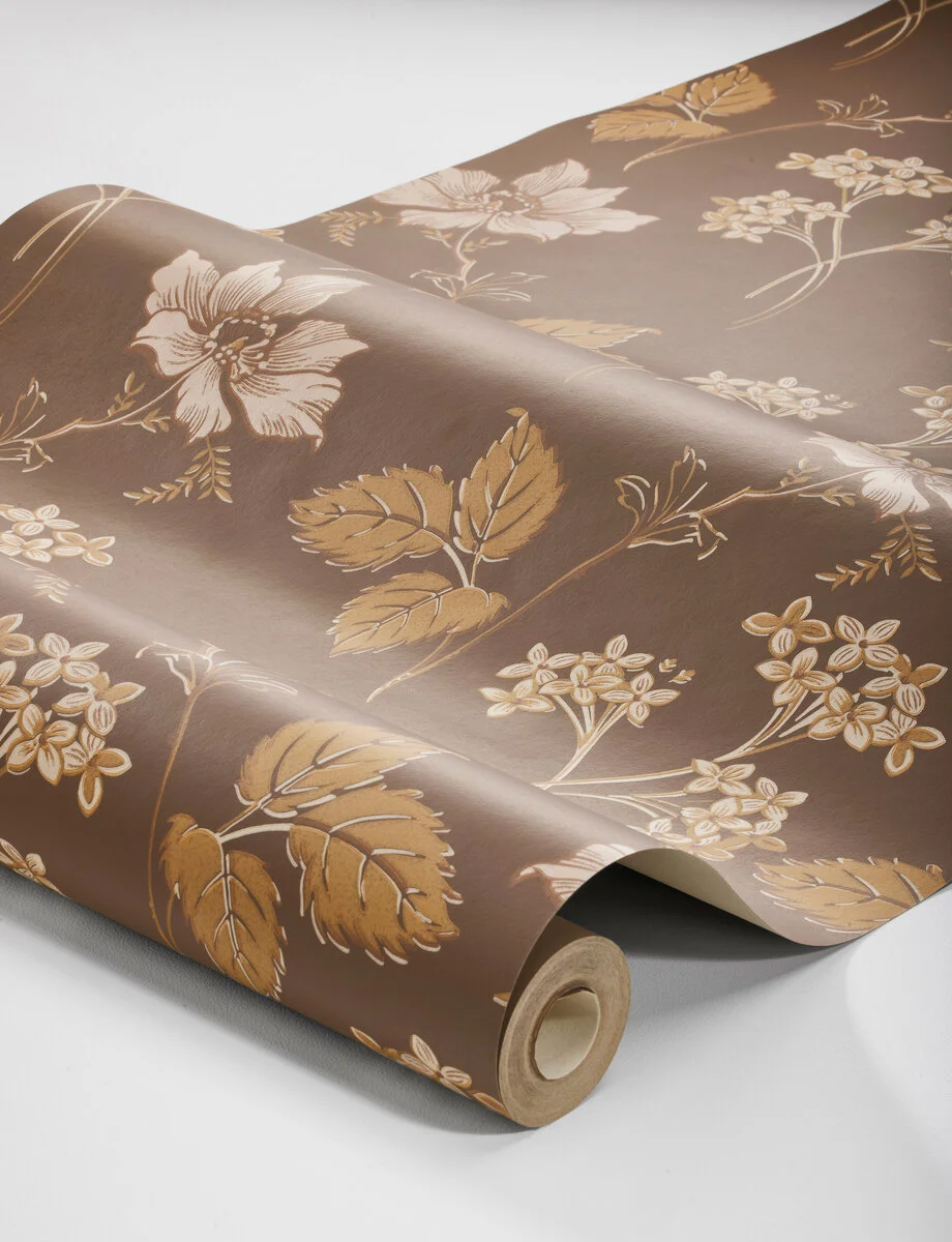 Ciemnobrązowe tło podkreśla jasnoróżowe elementy wzoru, dzięki czemu ściana zyskuje wyraźny, klasyczny charakter. Taka tapeta w kwiaty na ciemnym tle pasuje do wnętrz klasycznych, vintage oraz skandynawskich.