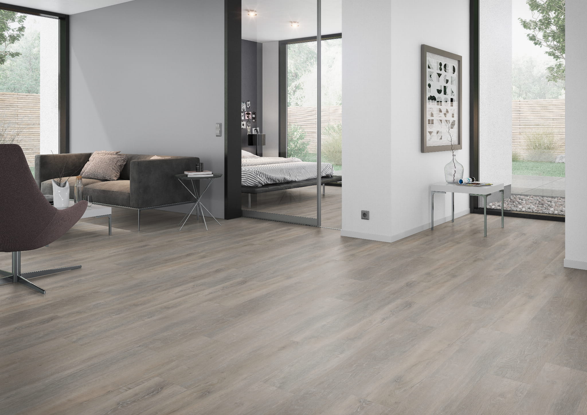 Podłogi w odcieniu greige z wyraźnym rysunkiem dębu; format XL 228,6 × 1524 mm podkreśla długość desek i zmniejsza liczbę łączeń. To podłoga winylowa montowana na klik (Rigid Click) z podkładem zintegrowanym w klasach 23/33/43 — rozwiązanie do mieszkań, obiektów komercyjnych i stref o zwiększonym obciążeniu.