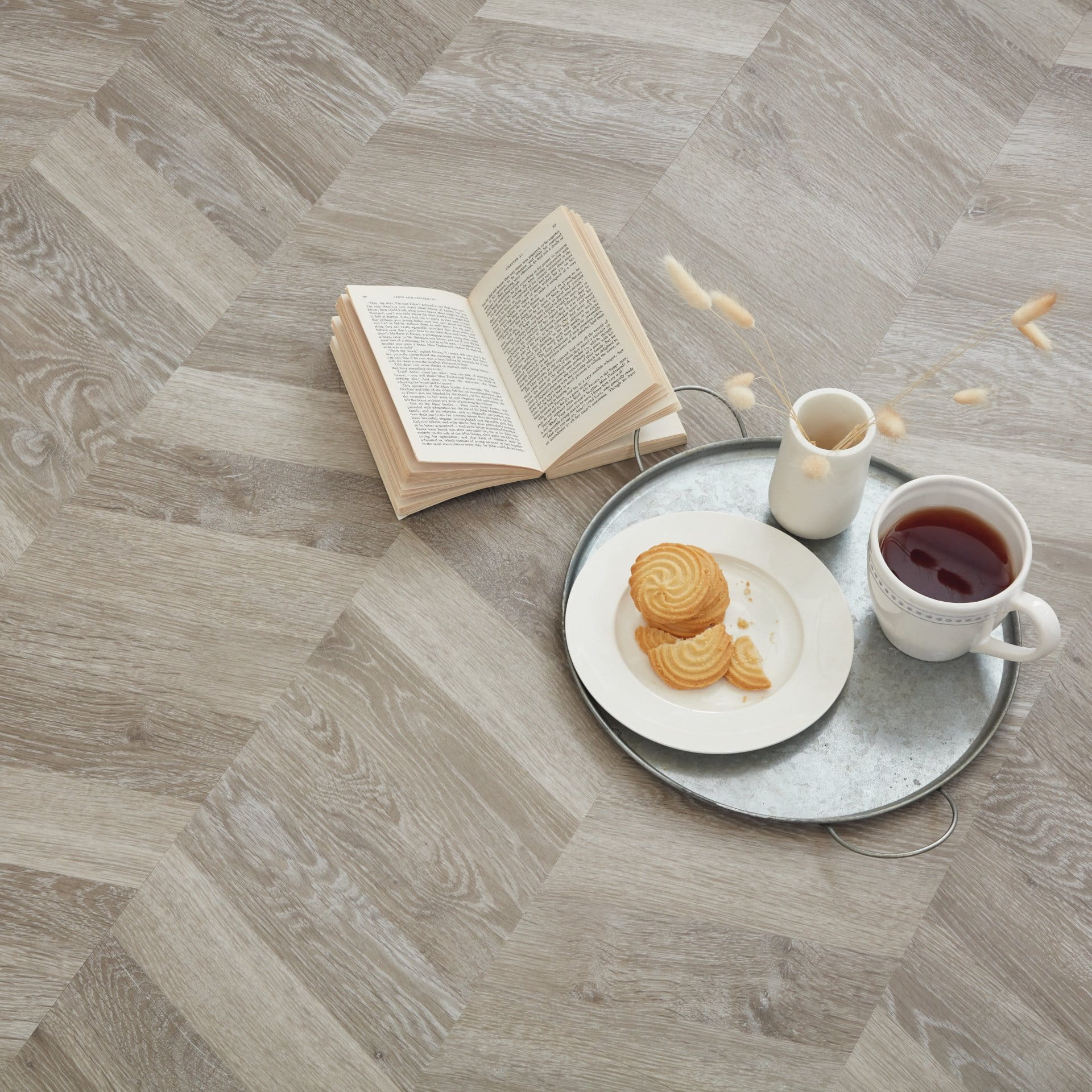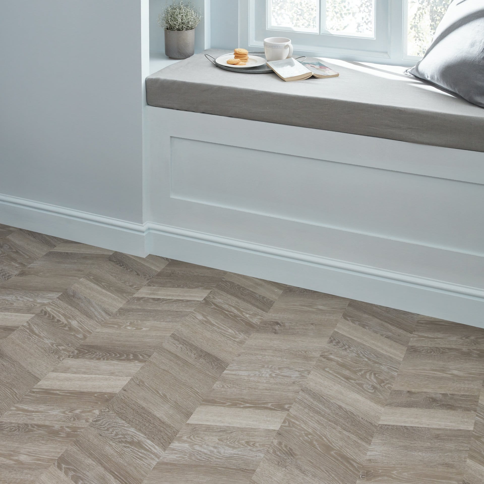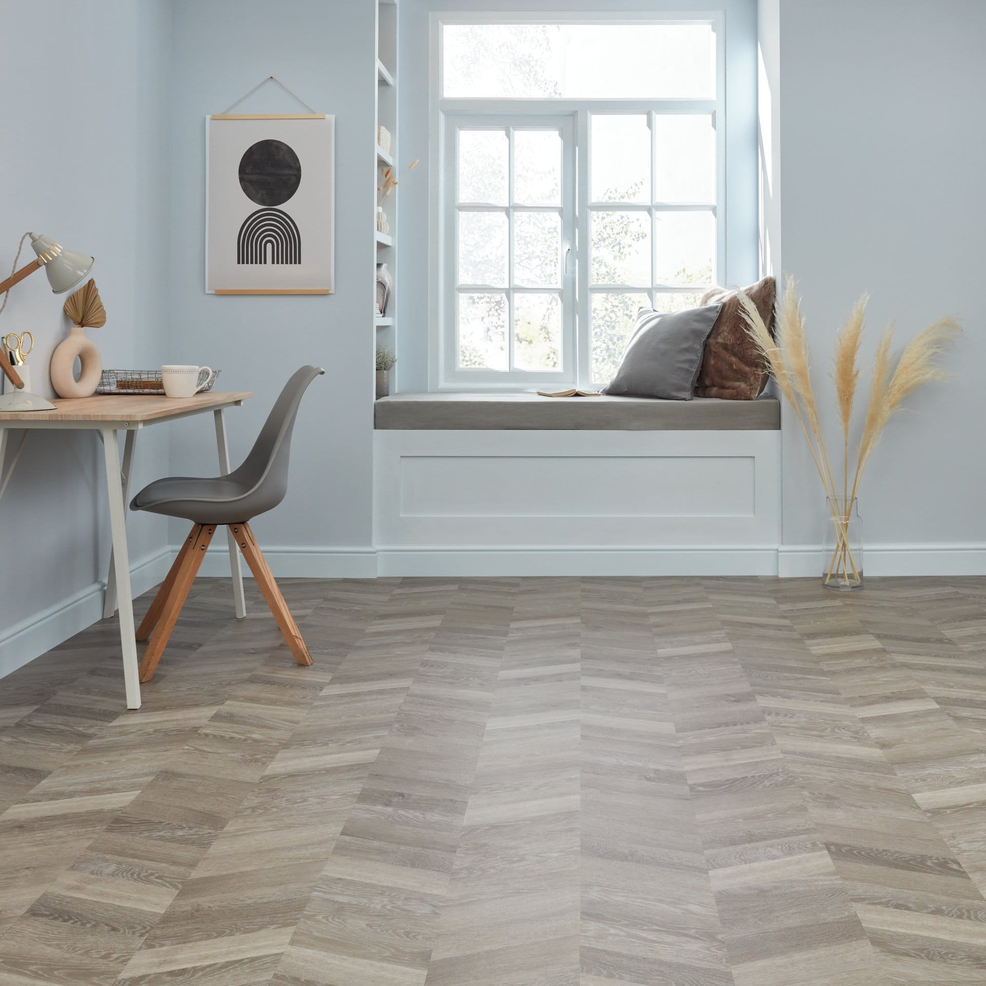 Podłoga Grey Washed Oak — charakteryzująca się mieszanką matowych szarych odcieni, nutami srebra i delikatnymi rysunkami słoi — jest dostępna w modnej ostatnio wersji w jodełkę. Dzięki wykonaniu z praktycznej dużej deski (1219 × 229 mm) i zastosowaniu gładkiej powierzchni stanowi idealny wybór, gdy chcemy pokazać swój styl lub poszerzyć wizualnie pomieszczenie.
