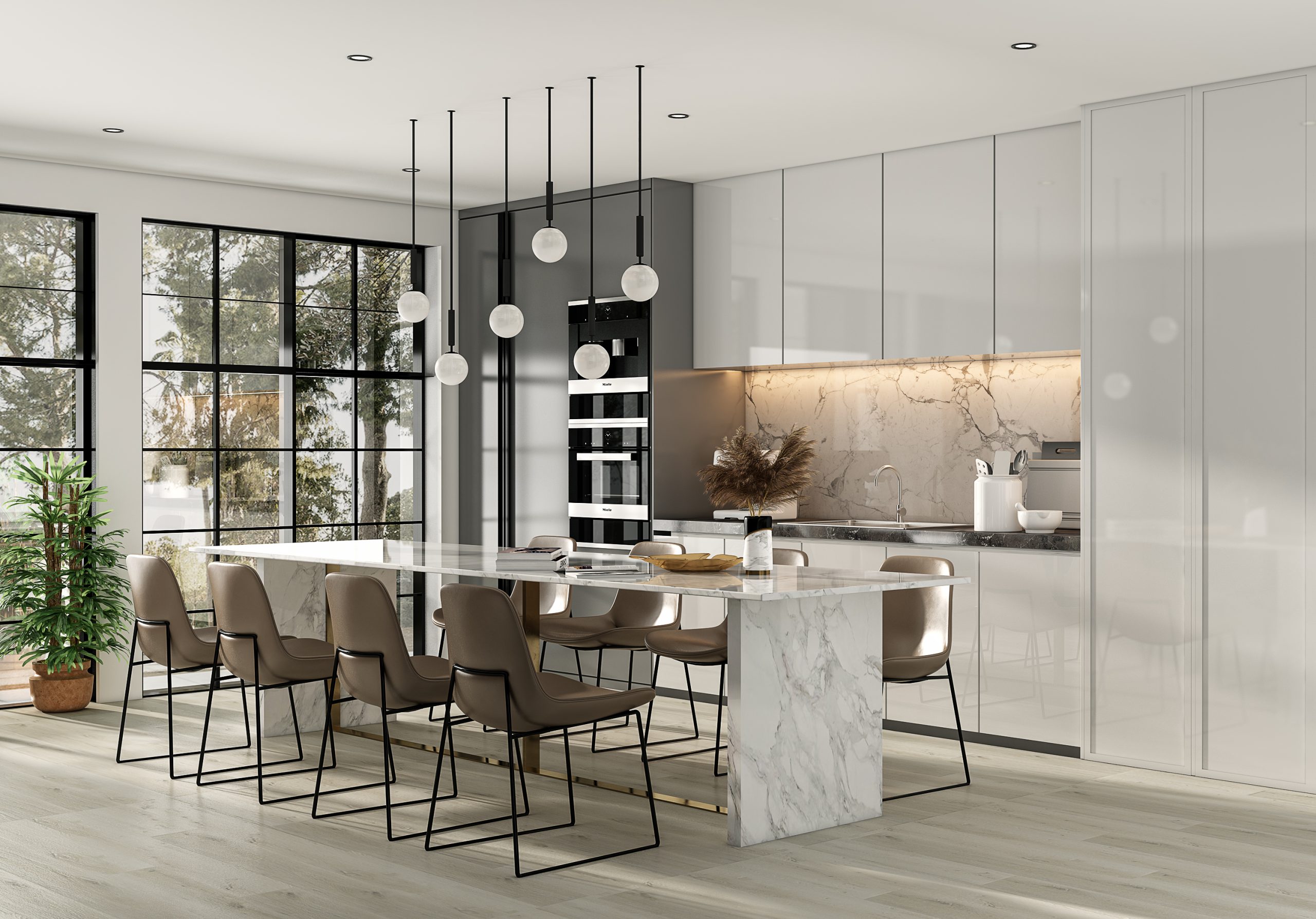 Neutralna, rozjaśniająca tonacja i równomierny dekor dębu sprzyjają spójnej powierzchni na większych metrażach. Panele winylowe na podłogę w układzie „deska” zachowują spokojny rysunek bez akcentowania wzorów układanych.