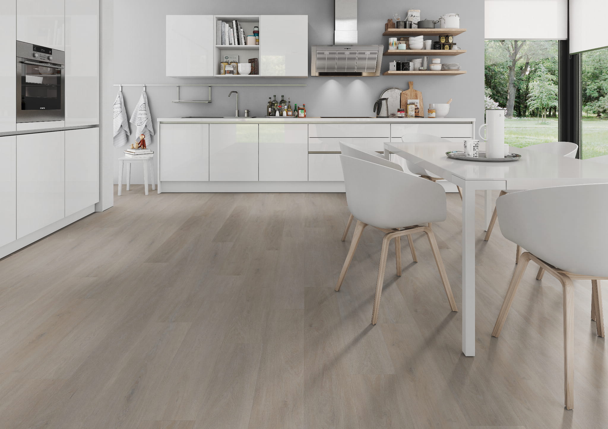 Produkt w odcieniu greige z naturalnym rysunkiem dębu; format XL 228,6 × 1524 mm podkreśla długość desek i ogranicza liczbę łączeń. To podłoga na klik (Rigid Click) z podkładem zintegrowanym w klasach 23/33/43 — do miejsc o większej eksploatacji.