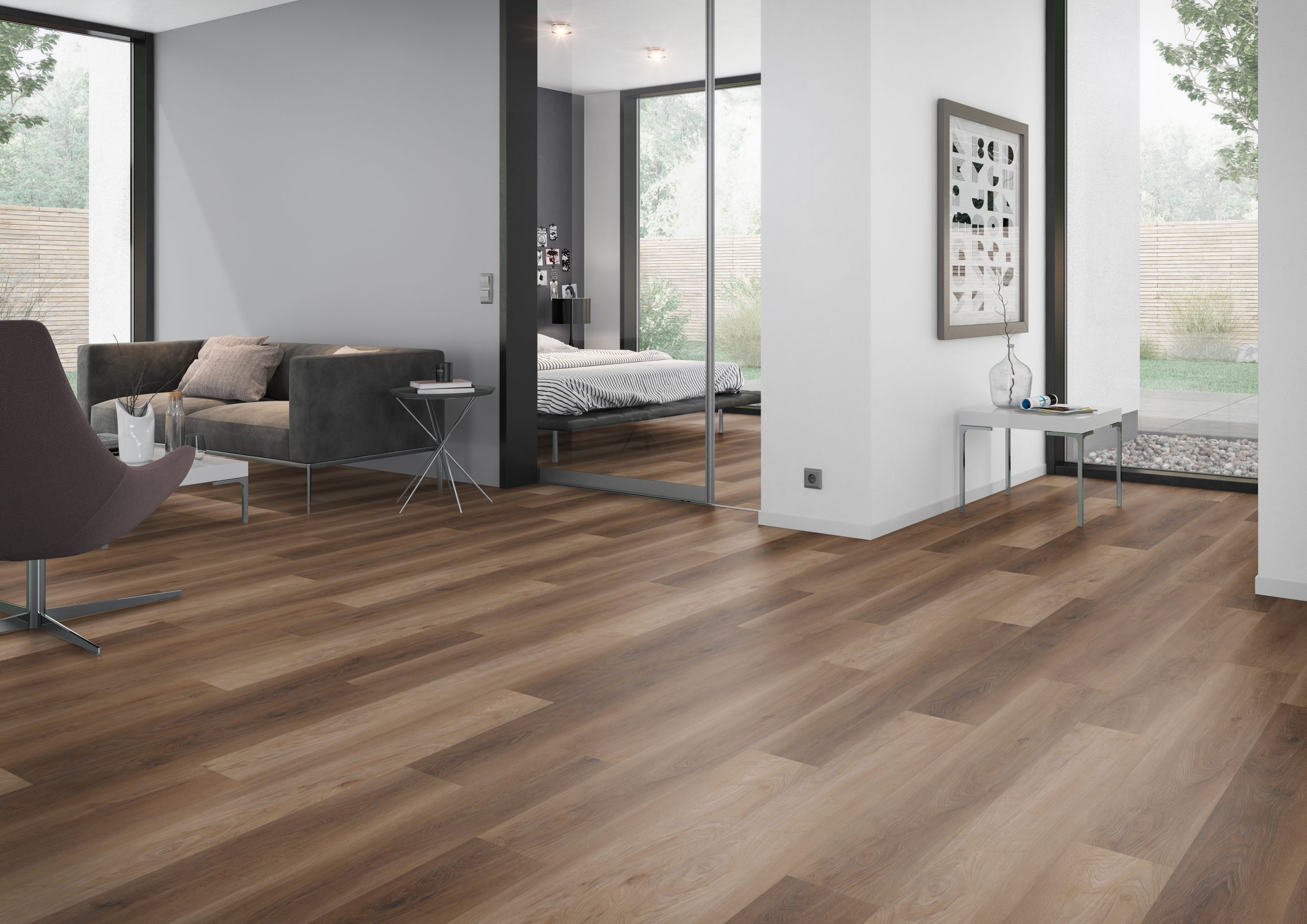 Produkt w klasycznym odcieniu orzecha z miękkimi przejściami między jaśniejszymi i ciemniejszymi pasmami. Rytm desek jest równy; co kilka listew pojawiają się delikatnie mocniejsze akcenty, które pogłębiają odbiór bez tworzenia ostrych kontrastów. Odpowiednia do łazienki