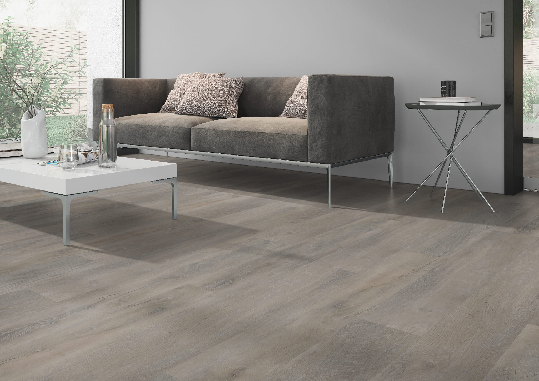 Podłoga winylowa w chłodno-beżowym odcieniu greige z widocznym, lecz spokojnym rysunkiem dębu. Dłuższe elementy 228,6 × 1524 mm porządkują powierzchnię i ograniczają łączenia. Wzór łączy subtelne sęki z delikatnymi przyrostami słojów, dzięki czemu rytm desek jest równy i nieprzerywany.