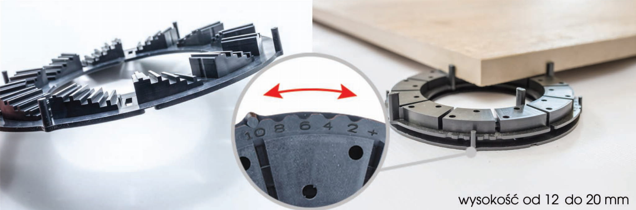 Podstawka VHCT pod płyty tarasowe o możliwej regulacji wysokości 12 -20 mm - element A+B. Podkładka regulacyjna B daje możliwość zmiany wysokości podstawki A z 12 do 20 mm (co 2 mm). Regulację wysokości wykonuje się przez obrót podstawki A względem podkładki B. Odpowiednią wysokość wskazuje kołek dystansowy.