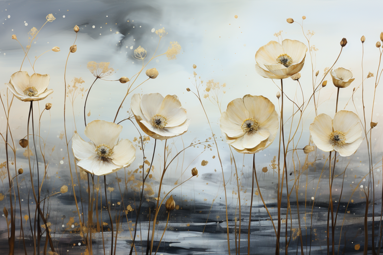 Nectar Neuf BN100 w tym olśniewającym muralu, białe kwiaty o złotych łodygach są jak promienie nadziei przebijające przez niepogodę. Ich płatki układają się w harmonijną kompozycję, jakby tańczyły w rytm wiatru. W tle gwałtowne niebo, rozszarpujące chmury, nadaje całości dramatyzmu i dynamiki. To jakby natura wyrażała swoją siłę i wytrwałość w obliczu przeciwności losu, emanując niezłomnym pięknem. Obraz ten jest nie tylko o kontraście między burzą a spokojem kwiatów, ale także o triumfie życia nad przeciwnościami.