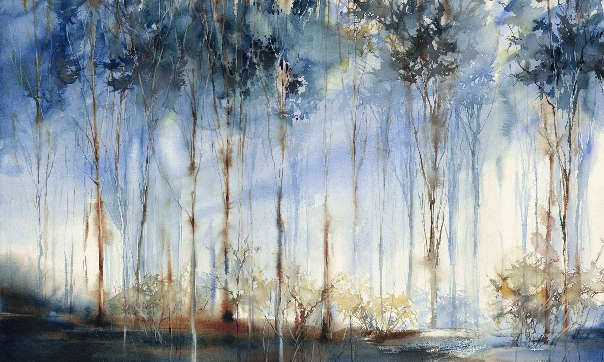 Tapeta Wonderwall Karelia to artystyczny mural przedstawiający mglisty las w delikatnych, akwarelowych barwach. Dominujące odcienie błękitu, beżu i złota tworzą subtelny efekt głębi, a rozmyte kontury drzew i roślinności nadają tapecie niemal oniryczny charakter. To tapeta Wonderwall, która wprowadza do wnętrza harmonię, spokój i naturalną elegancję, doskonale sprawdzając się w aranżacjach inspirowanych sztuką i krajobrazem.
