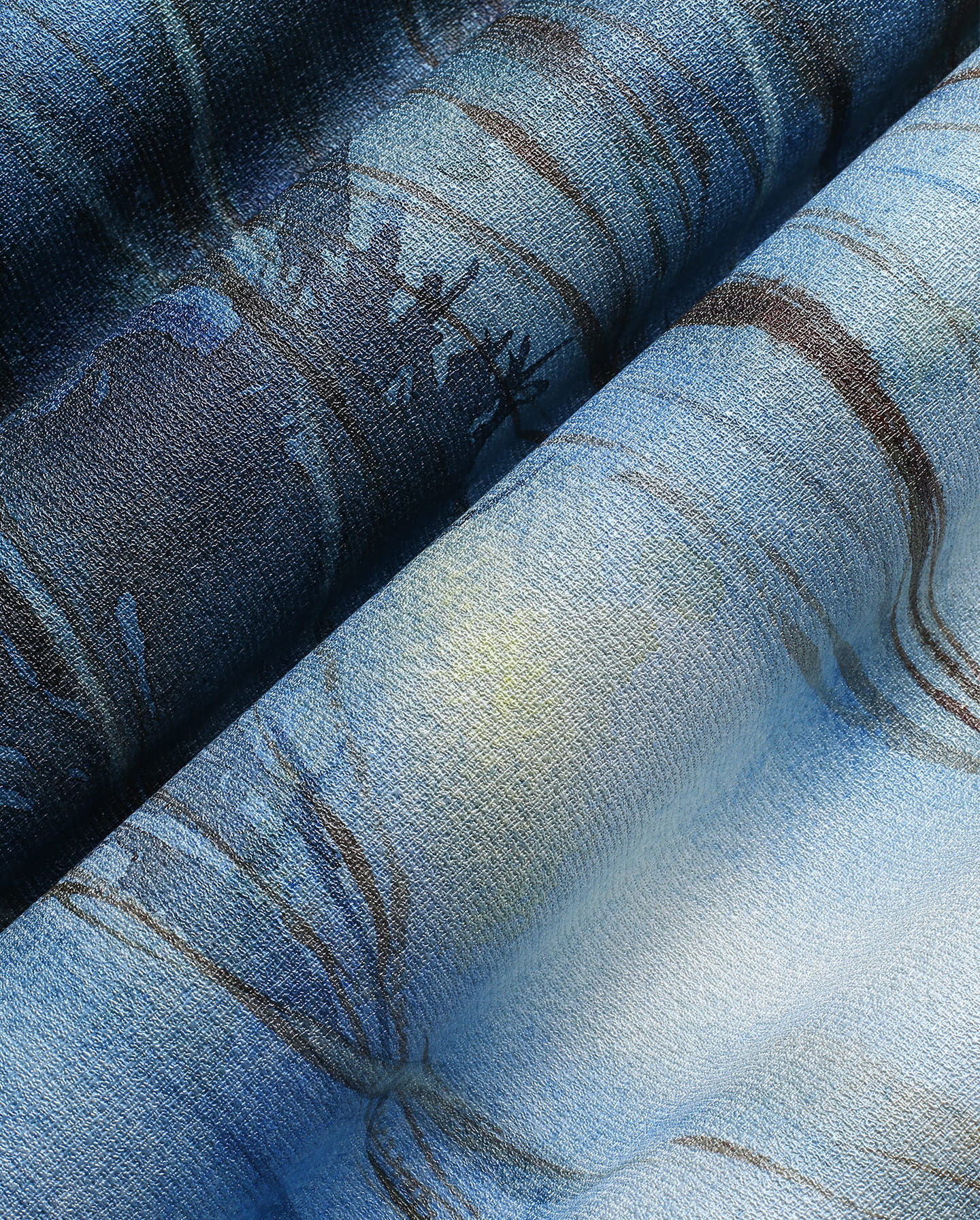 Wonderwall tapeta do sypialni Karelia to idealne rozwiązanie dla osób, które pragną stworzyć w swojej przestrzeni atmosferę relaksu i spokoju. Stonowane odcienie błękitu i beżu działają kojąco, a subtelnie rozmyte detale leśnej scenerii wprowadzają do wnętrza harmonię. Tapeta świetnie komponuje się z lnianymi tkaninami, jasnym drewnem i delikatnym oświetleniem, podkreślając ciepły i naturalny wystrój sypialni.