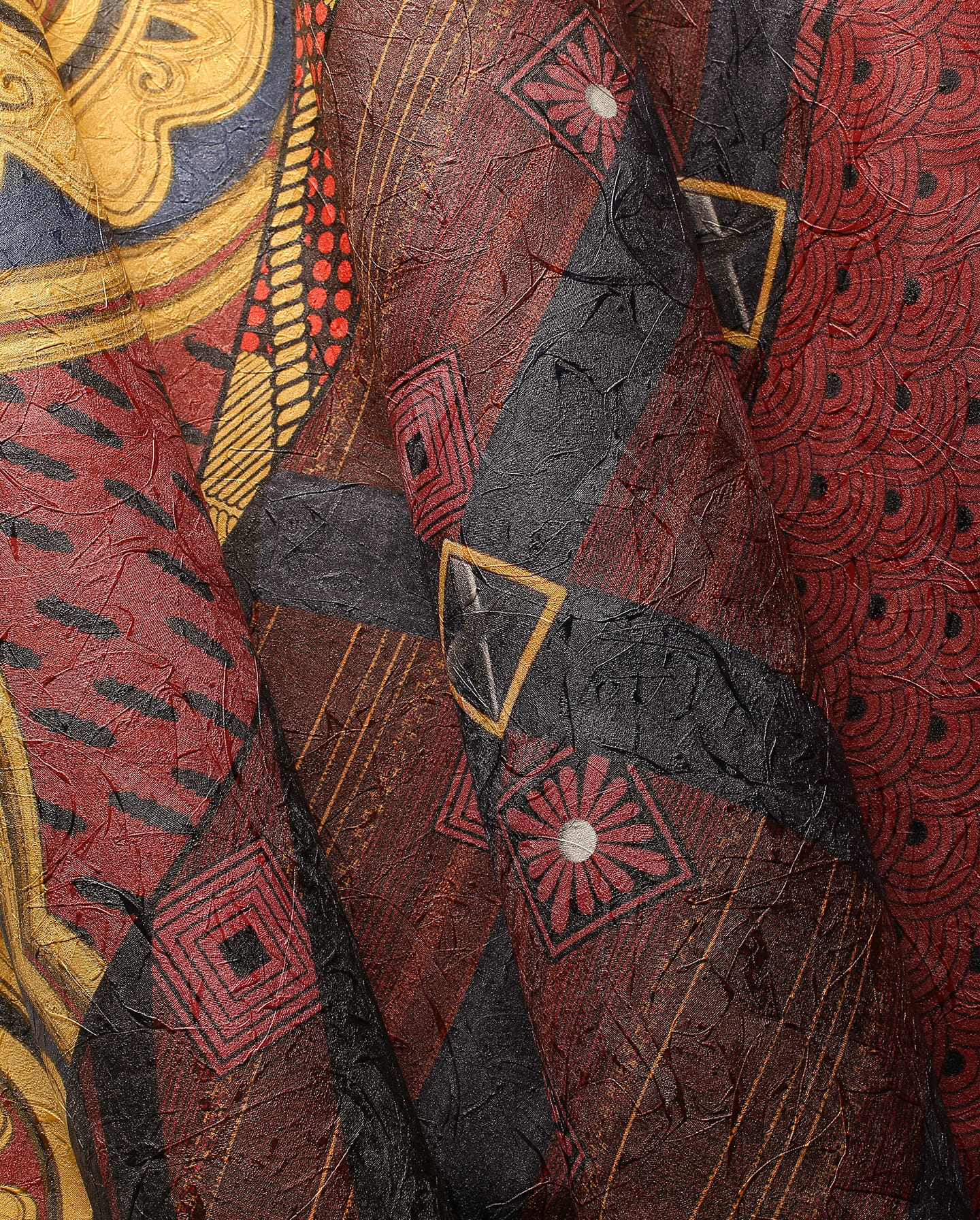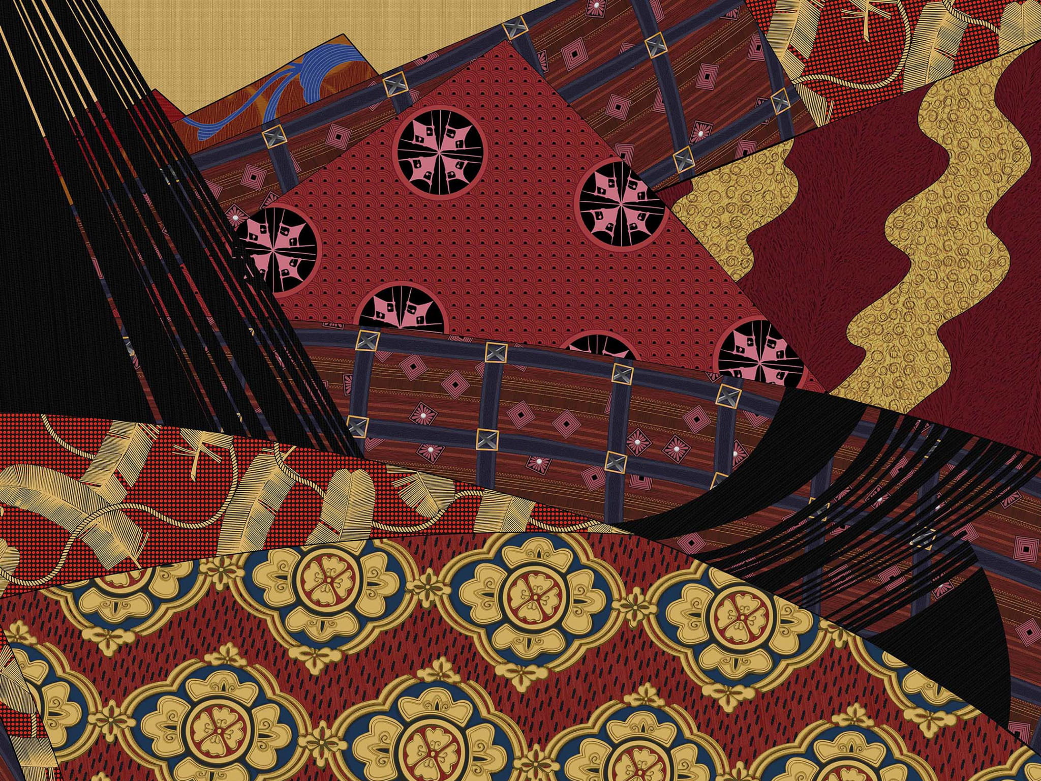 Tapeta Wonderwall Lady Sei to niezwykle dekoracyjny mural inspirowany tradycyjnymi japońskimi tkaninami i wzorami. Bogata kompozycja geometrycznych kształtów, ornamentów i złotych detali nadaje tapecie wyjątkowy, luksusowy charakter. Dominujące odcienie czerwieni, złota i czerni sprawiają, że tapeta prezentuje się efektownie i wprowadza do wnętrza orientalny, arystokratyczny styl. To tapeta Wonderwall, która doskonale sprawdzi się w eleganckich, eklektycznych i artystycznych aranżacjach.