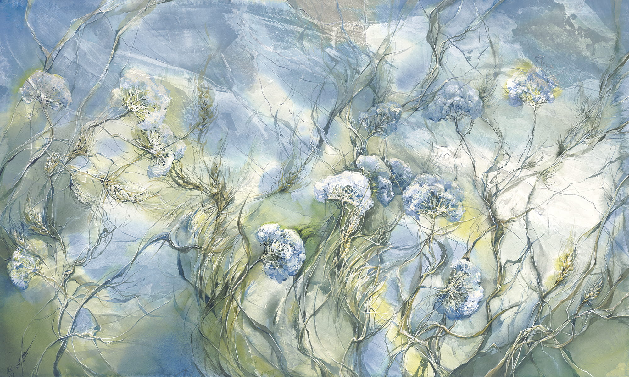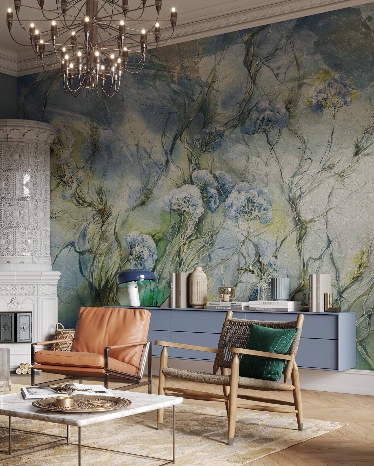 Tapeta Wonderwall Novek 35 0723 01 to nie tylko funkcjonalność, ale i piękno. Zdjęcie przedstawia abstrakcyjne, botaniczne wzory w odcieniach niebieskiego, zieleni i błękitu. Delikatne linie gałęzi tworzą misterną sieć, a niektóre kwiatostany wyglądają, jakby unosiły się na wietrze. Ta tapeta dodaje wnętrzu tajemniczości i artystycznego charakteru.