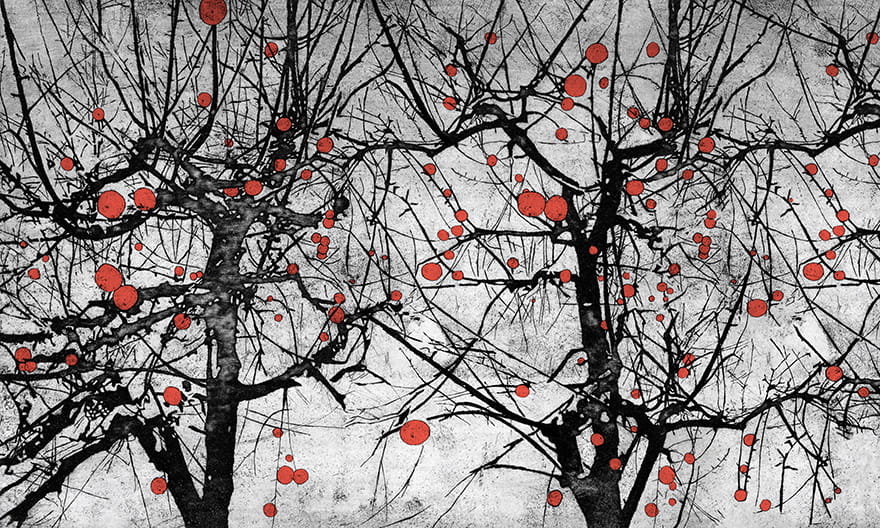 Wonderwall tapeta Vibrant to wyjątkowy mural, który przyciąga uwagę swoją kontrastową kompozycją. Czarnobiałe gałęzie drzew zestawione z wyrazistymi czerwonymi akcentami w formie owoców tworzą niezwykle oryginalny i dynamiczny efekt wizualny. Ten wzór to propozycja dla osób, które chcą nadać swojemu wnętrzu nowoczesnego charakteru i artystycznej głębi. Fototapeta Wonderwall dostępna jest w wymiarach standardowych 500 x 300 cm, ale może być dostosowana do indywidualnych wymagań przestrzeni.