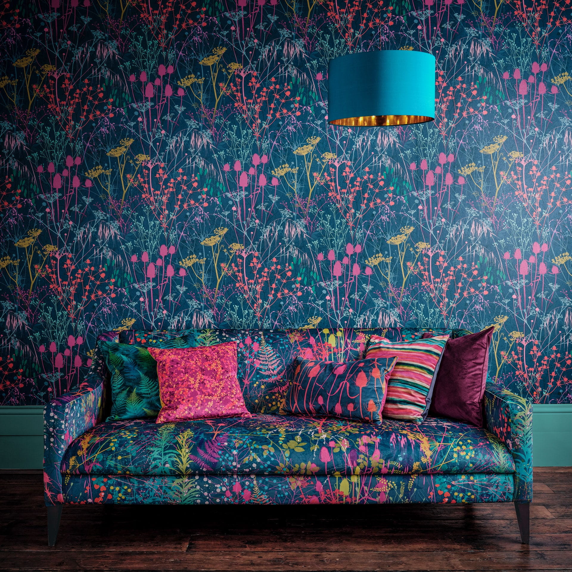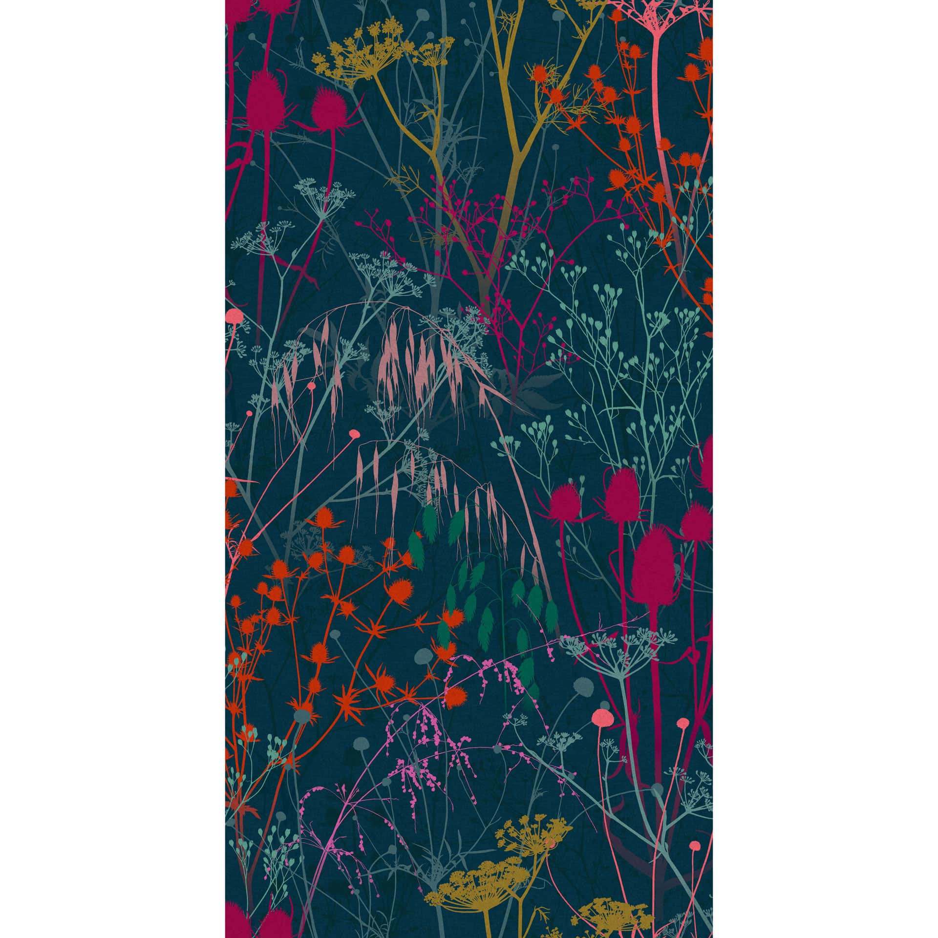 Ta tapeta Summer Border przedstawia portret tęczowej łąki dzikości na głębokim, morskim tle. Projekt zainspirowany był jednym z ulubionych miejsc Clarissy – magicznym ogrodem należącym do jej przyjaciółki i znanej projektantki ogrodów, Tani Compton. Obfity plątanina traw, ostów, główek nasion kopru i werbeny oddaje esencję dzikiej i naturalnej piękności.