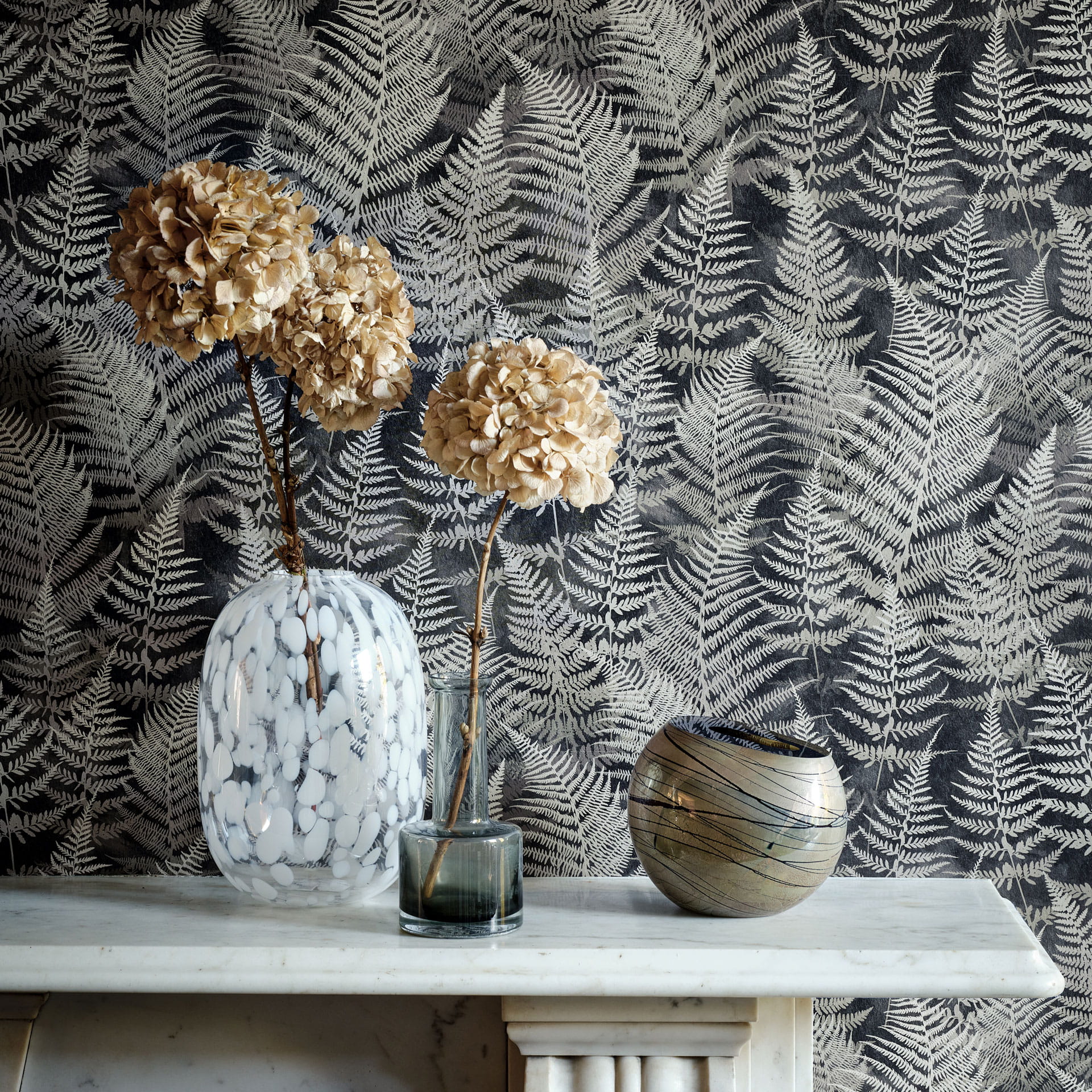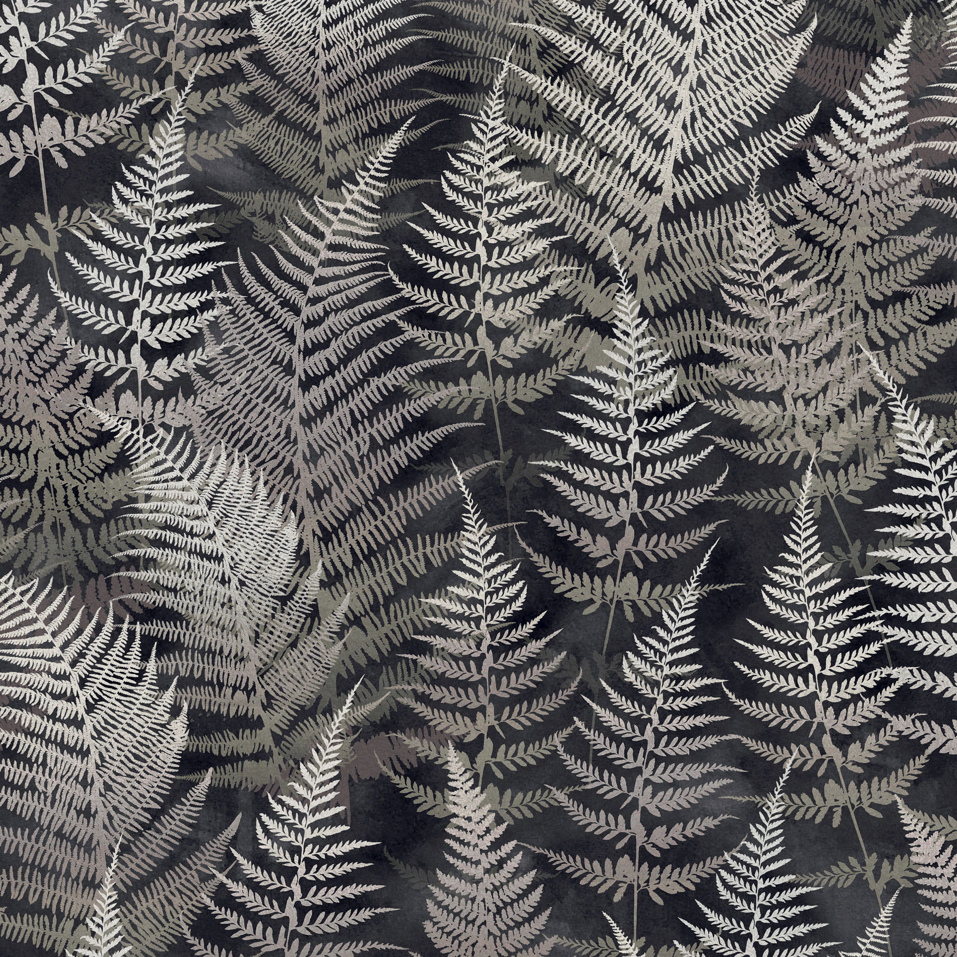 Nasza tapeta Woodland Fern przedstawia eleganckie liście paproci, które zdają się świecić w półcieniu lasu. Sugestywna paleta kolorów, w której dominują węgiel i ombre srebro, doda głębi i świetlistości każdej aranżacji.