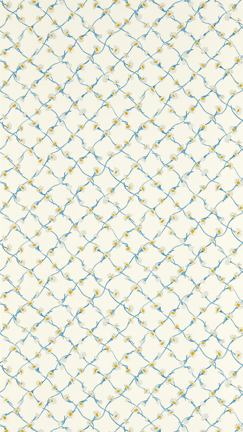Tapeta Harlequin X Sophie Robinson Daisy Trellis 113044 to urocze stokrotki, zebrane z ogrodu i ręcznie pomalowane w pracowni, łączą się, tworząc piękną tapetę w formie pnącza, która zachowuje szczegółowość każdej pojedynczej główki kwiatu.