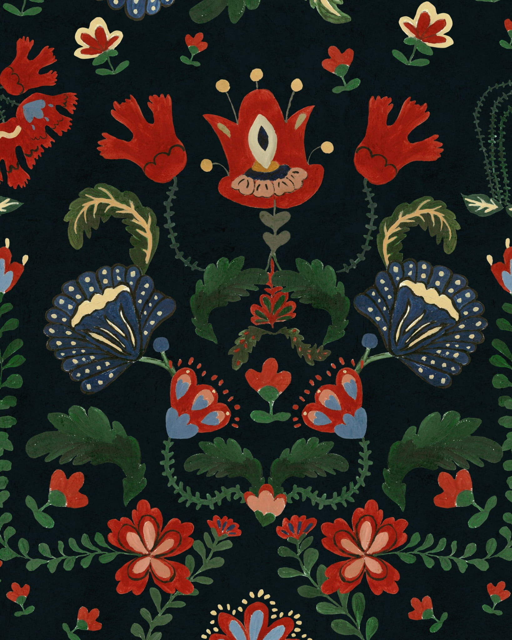 Tapeta Zabola z kolekcji Transylvanian Roots marki Mind The Gap w piękny folklorystyczny motyw. Wzór w lokalne kwiaty lasów karpackich. Okładzina świetnie sprawdzi się w domkach w górach lub dla miłośników góralskich akcentów.