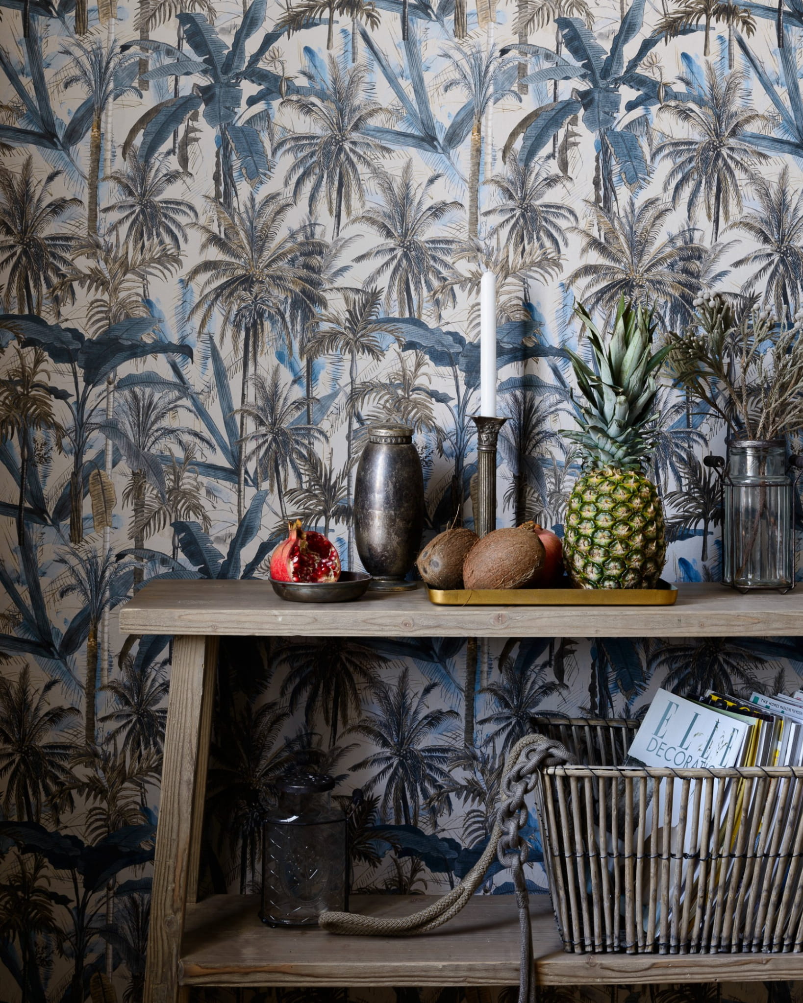 Tapeta The Jungle z kolekcji Tropical Wanderlust marki Mind The Gap inspirowana bujną roślinnością dżungli Amazonki. Wzór przedstawia ilustrowane palmy i roślinność tropikalną. Okładzina świetnie sprawdzi się w przedpokoju, salonie lub sypialni. Dostępna jest w 2 wariantach kolorystycznych.