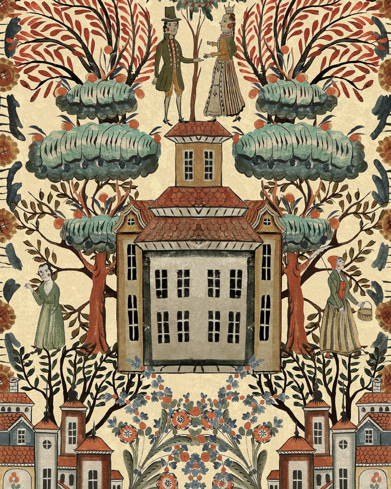 Tapeta TALES OF TYROL Taupe WP20684 z kolekcji TYROL APRES-SKI HOME COLLECTION marki Mind The Gap wkracza do świata cudów za sprawą TALES OF TYROL, magicznego wzoru, w którym tyrolska architektura i wiejskie postaci spotykają się pod fantastycznym baldachimem liści. Osiągnięte różkowymi policzkami w swoich tradycyjnych strojach, te urocze postacie zamieszkują zmyślone miasteczko otoczone drzewami i kwiatami w wielu odcieniach przypominających klejnoty.