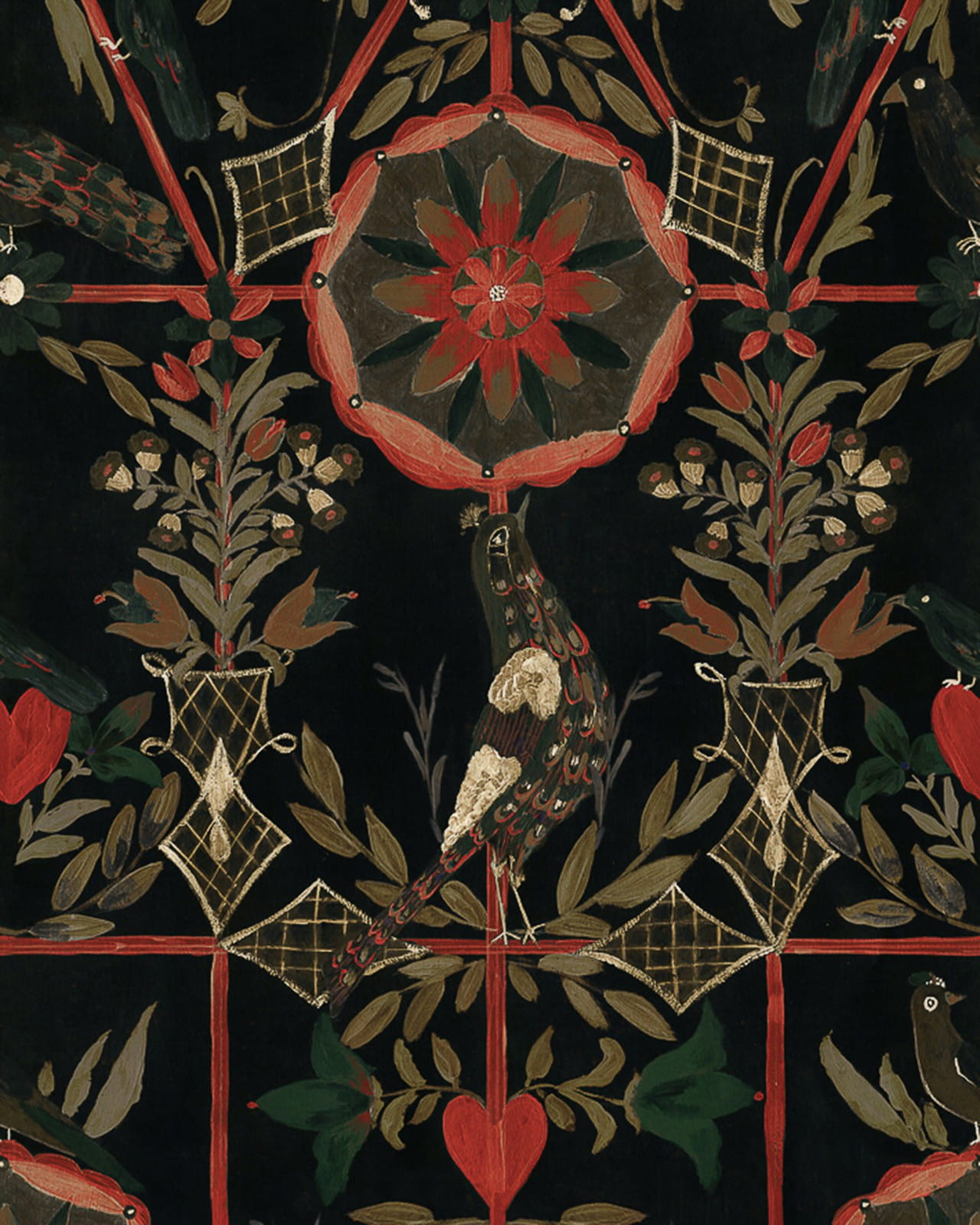 Tapeta THE BIRD HOUSE Black WP20677 z kolekcji TYROL APRES-SKI HOME COLLECTION marki Mind The Gap na delikatnej kratce przypominającej starą ptasiarnię, THE BIRD HOUSE ukazuje stado pięknych ptaków, unoszących się z tyrolskich gór. Między nimi snują się delikatne kwiaty i liściaste girlandy, które nadają temu uroczemu wzorowi kompletność. Kremowe tło tworzy kobiece wrażenie, a dramatyczna czerń nadaje mu tajemniczy charakter.
