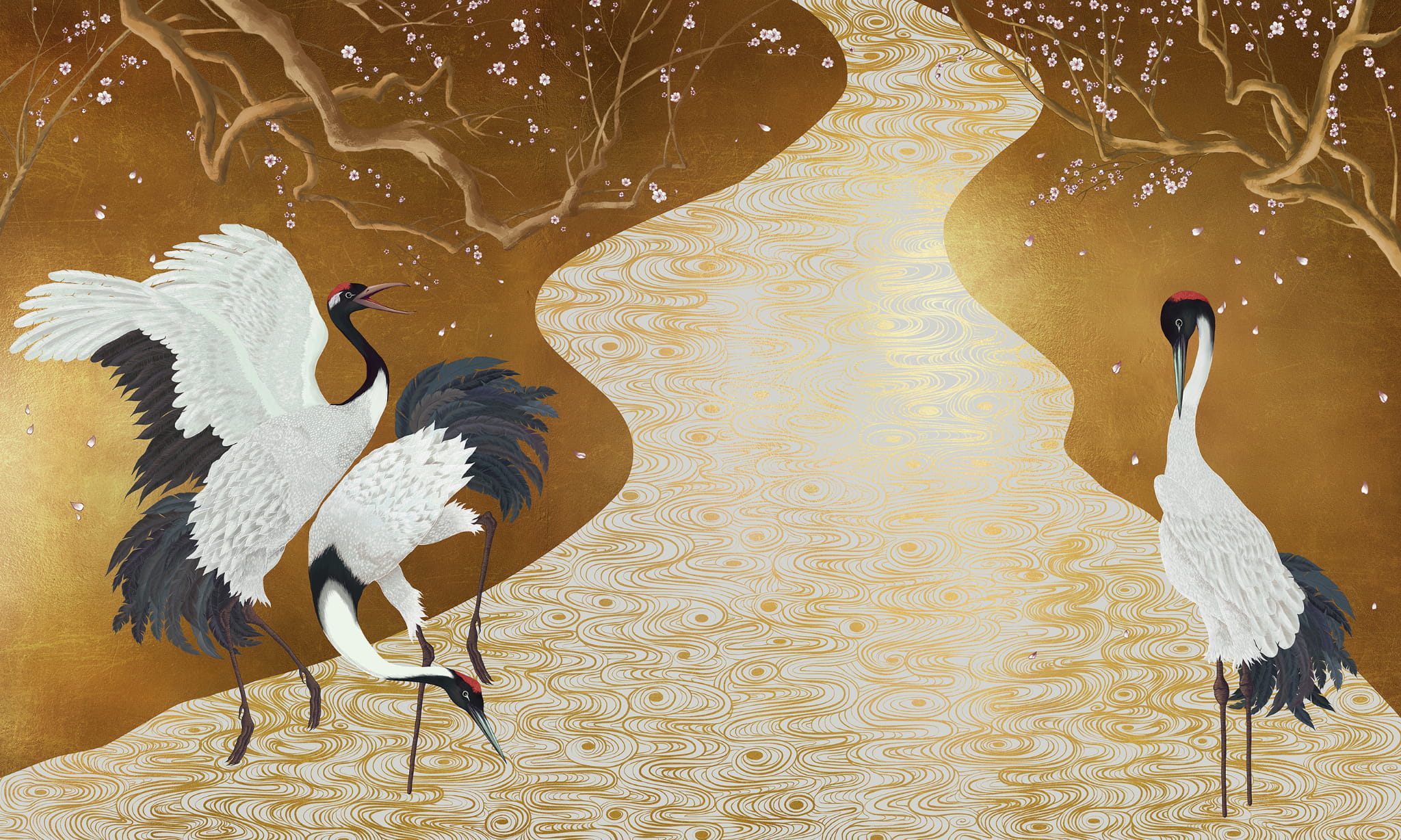 Tapeta Wonderwall Alba – mural z żurawiami w otoczeniu złocistych akcentów