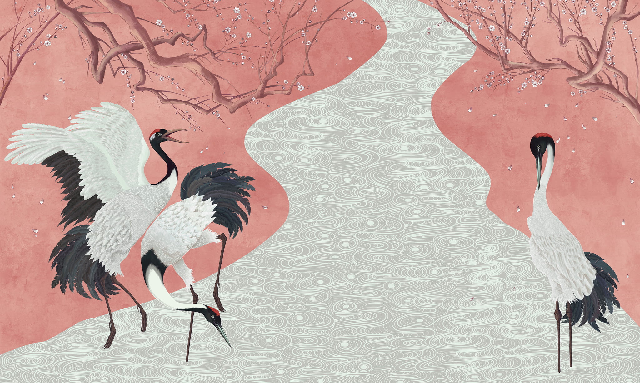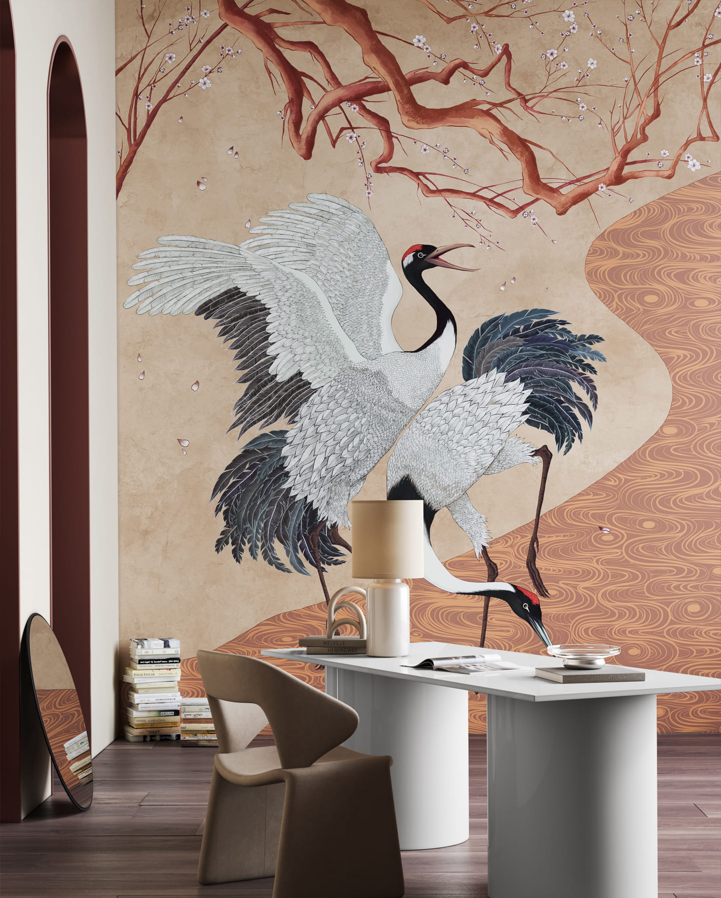 Tapeta Wonderwall Alba – żurawie i sakura w pastelowej harmonii