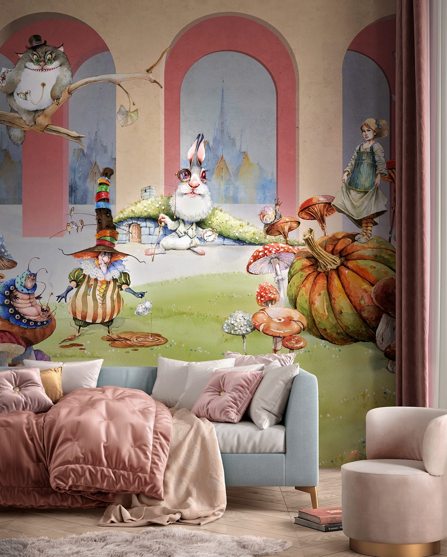 Wonderwall tapeta Alice to mural inspirowany kultową historią o Alicji w Krainie Czarów. Przepiękne ilustracje przedstawiające magiczne postacie, grzyby i baśniowy krajobraz przeniosą Cię do świata wyobraźni. Dzięki pastelowym kolorom i szczegółowo dopracowanemu wzornictwu, fototapeta Wonderwall Alice wprowadza do wnętrza unikalny klimat, który przyciąga spojrzenia. Tapeta dostępna jest w standardowym wymiarze 500 x 300 cm, z możliwością zamówienia indywidualnych rozmiarów.