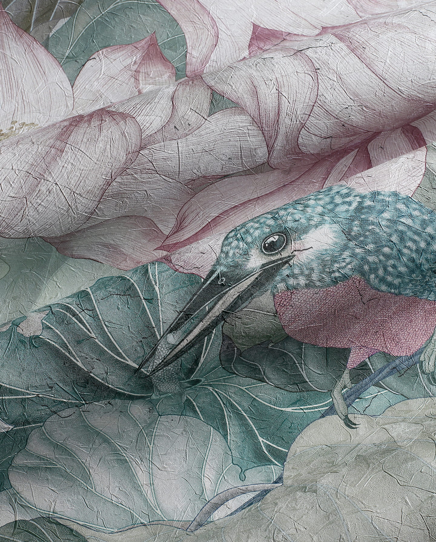Tapeta Wonderwall Allia to mural inspirowany naturą, w którym kwitnące lotosy i małe ptaki tworzą spójną, pełną wdzięku kompozycję. Malarskie detale, pastelowe odcienie różu, mięty i szarości oraz subtelne postarzenia tła nadają tapecie wyjątkowy, romantyczny charakter. Dzięki efektowi głębi i harmonijnym barwom jest to tapeta Wonderwall, która wprowadza do wnętrza delikatność i spokój.
