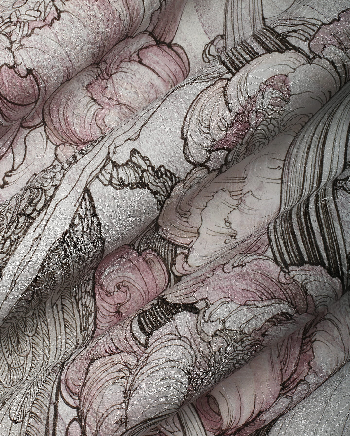 Tapeta Wonderwall Asami to wyjątkowe połączenie delikatnych kwiatów piwonii i majestatycznego ptaka, tworzące kompozycję pełną wdzięku i elegancji. Inspirowana sztuką orientalną, wyróżnia się precyzyjnymi detalami oraz subtelną paletą kolorystyczną, w której dominują odcienie różu, beżu i szarości.