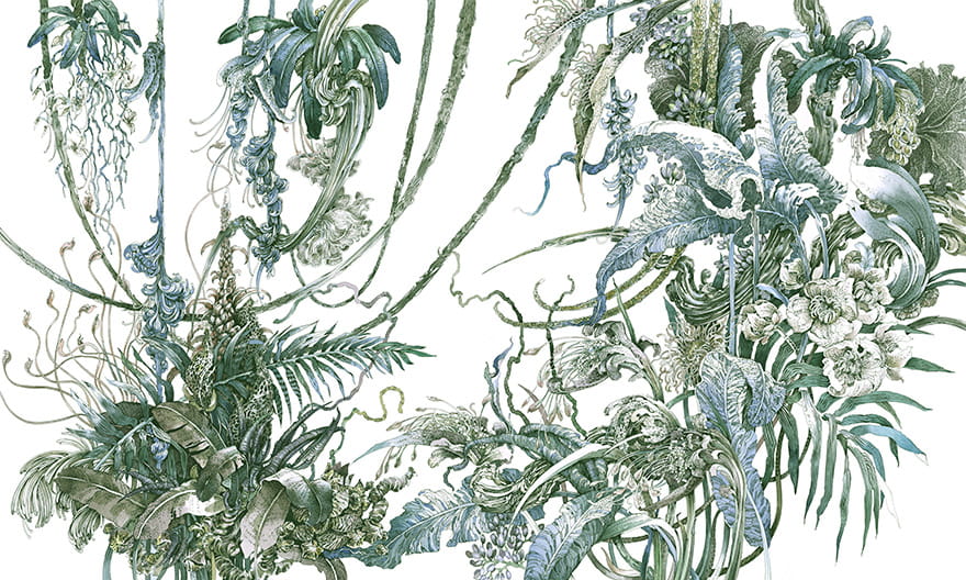 Grafika przedstawia egzotyczne rośliny i kwiaty w delikatnej, zielonej kolorystyce. Ten unikalny mural tworzy atmosferę pełną spokoju i elegancji, doskonale komponując się z różnymi stylami wnętrzarskimi. Subtelne detale botanicznych motywów w połączeniu z wyrazistymi, naturalnymi formami sprawiają, że ta tapeta jest idealnym wyborem do salonów, sypialni czy przestrzeni reprezentacyjnych.