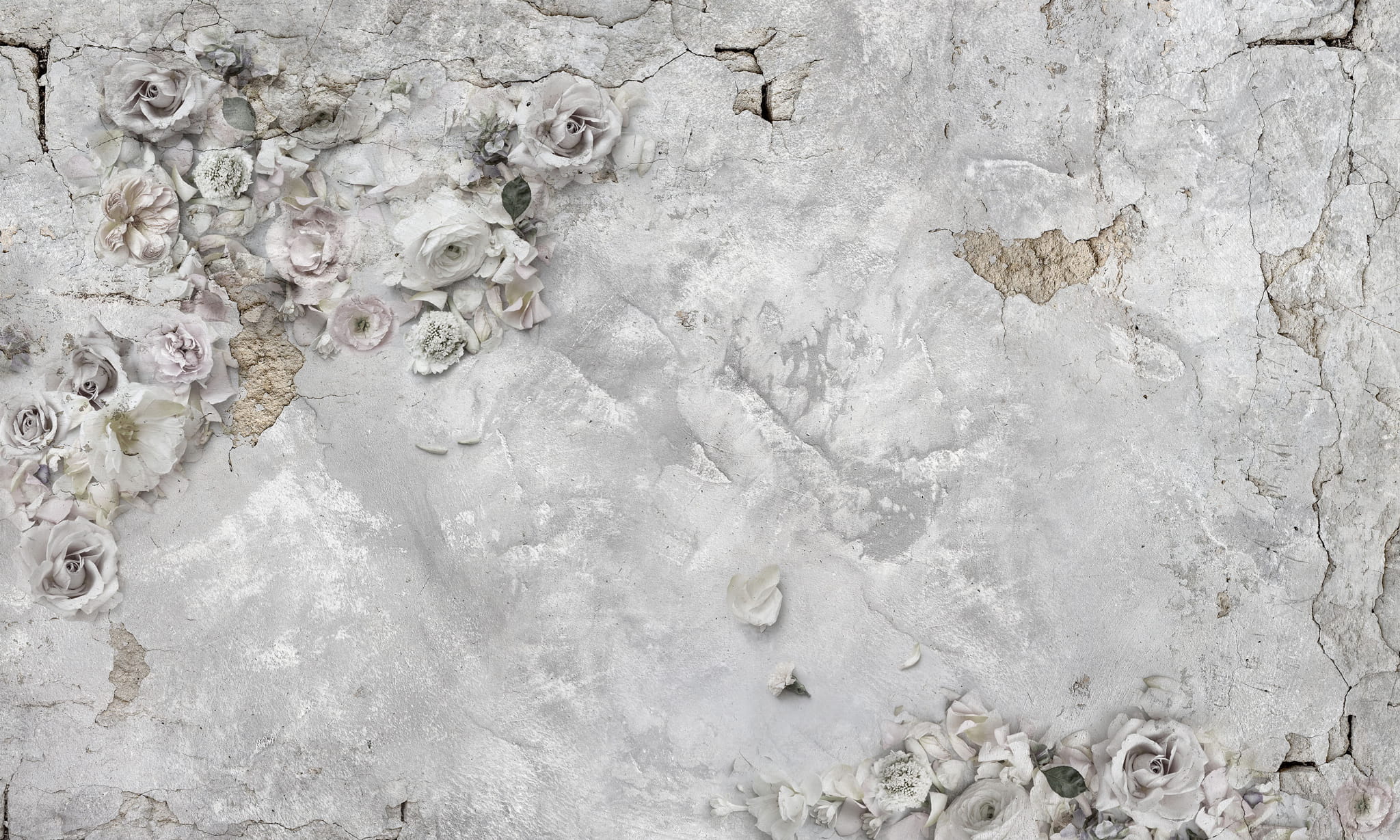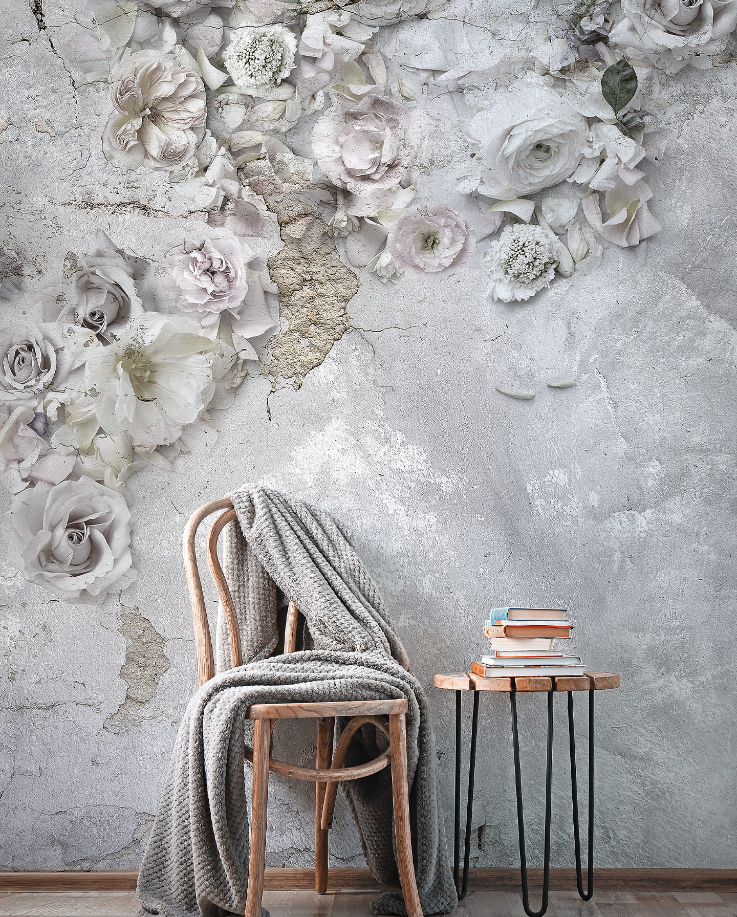 Romantyczne róże w pastelowych odcieniach delikatnie przełamują surowość tła, przypominającego postarzany beton lub tynk. To subtelne połączenie kontrastujących elementów sprawia, że tapeta przyciąga wzrok i nadaje wnętrzom artystycznego charakteru.