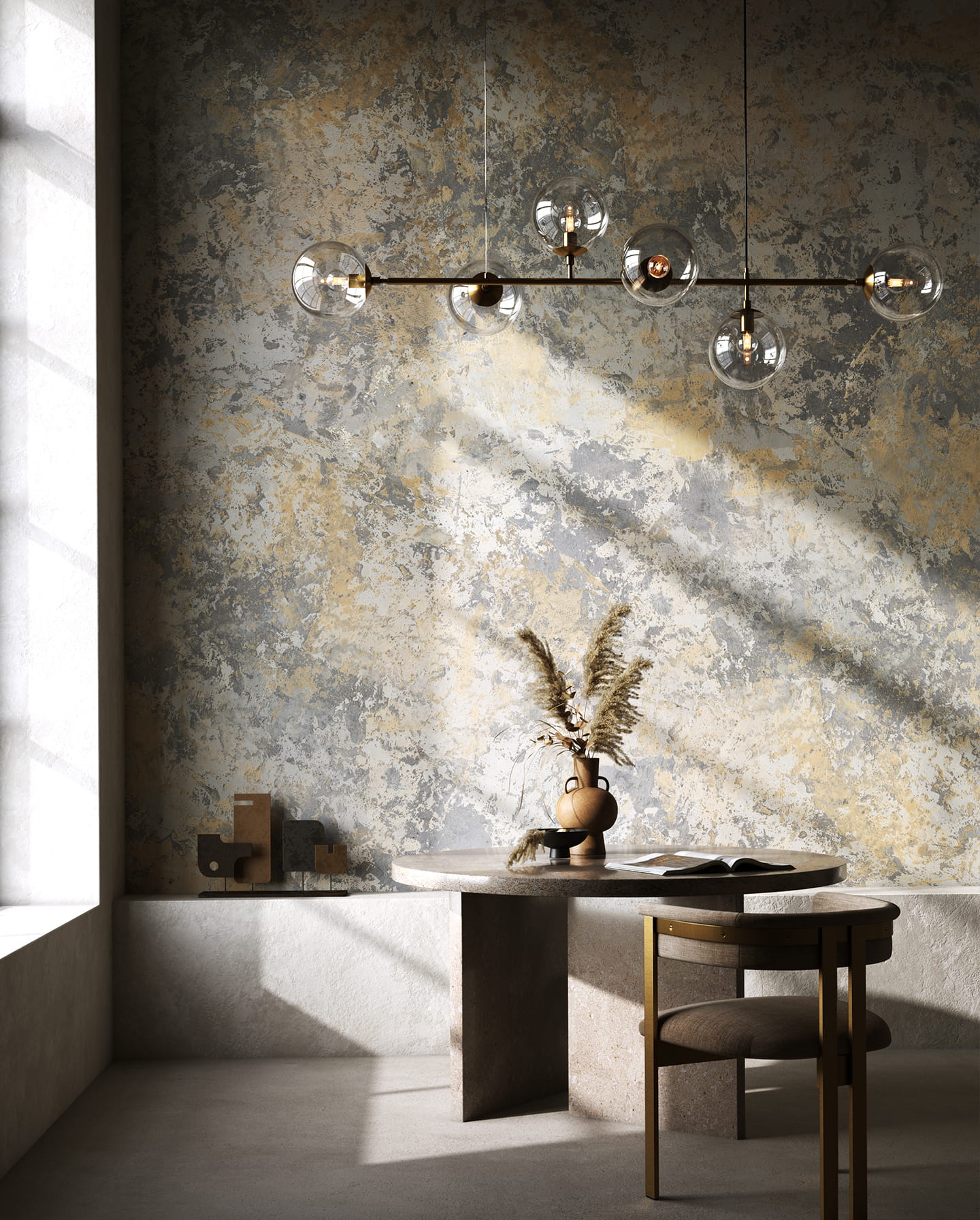 Delikatny, monochromatyczny wzór w odcieniach szarości przypomina subtelne efekty tynku strukturalnego lub betonu. Jego uniwersalny charakter sprawia, że tapeta stanowi idealne tło dla różnych stylów wnętrz – od nowoczesnych, przez industrialne, aż po klasyczne.