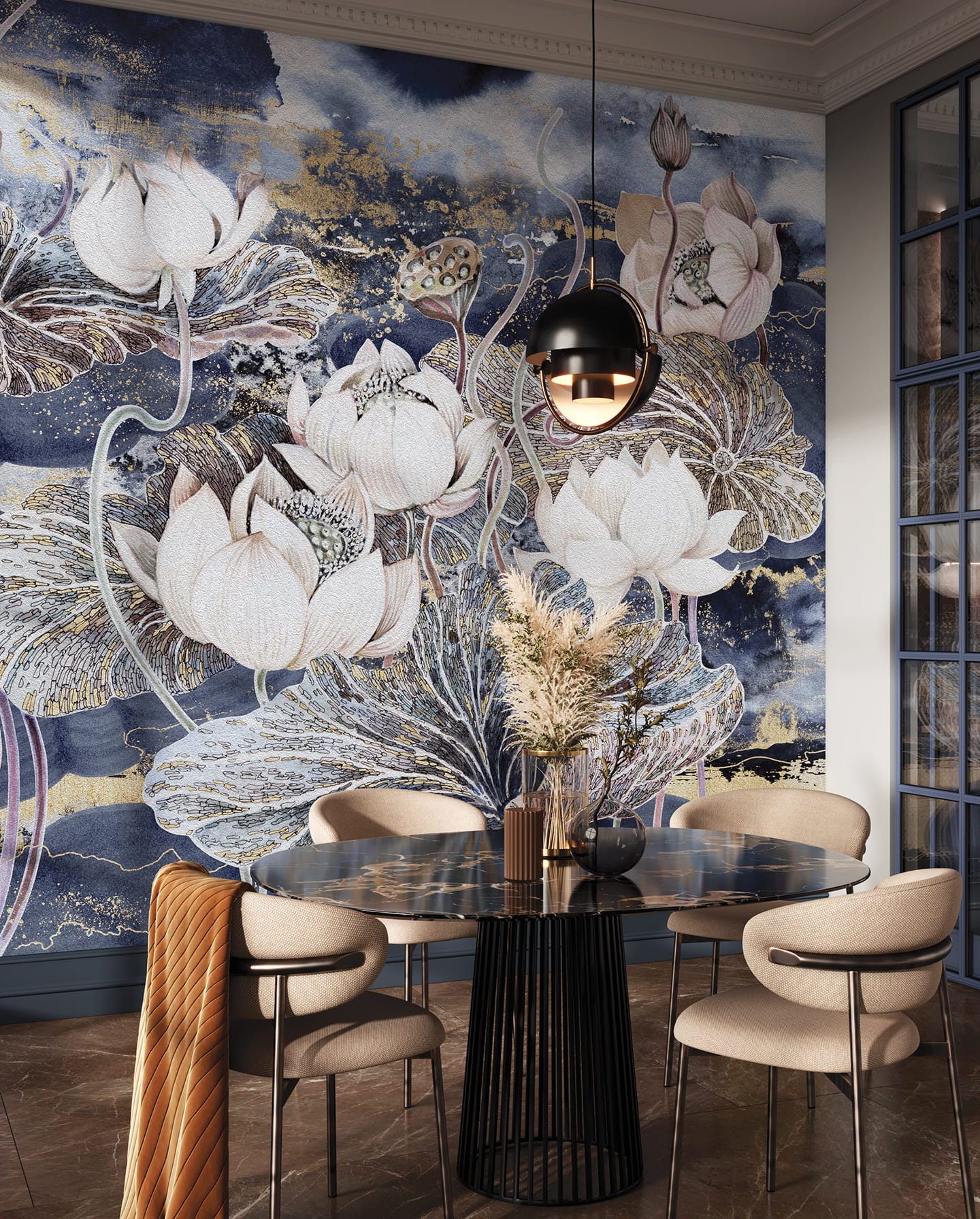 Dzięki efektowi trójwymiarowości, tapeta 3D do salonu Cassiopeia wprowadza do wnętrza wyjątkowy charakter. Lotosy na tle nocnego nieba tworzą kompozycję, która optycznie powiększa przestrzeń i nadaje jej głębi. To idealne rozwiązanie dla osób, które chcą dodać wnętrzu luksusu i niepowtarzalności. Tapeta świetnie komponuje się z nowoczesnymi meblami i dodatkami w złotych lub metalicznych odcieniach.
