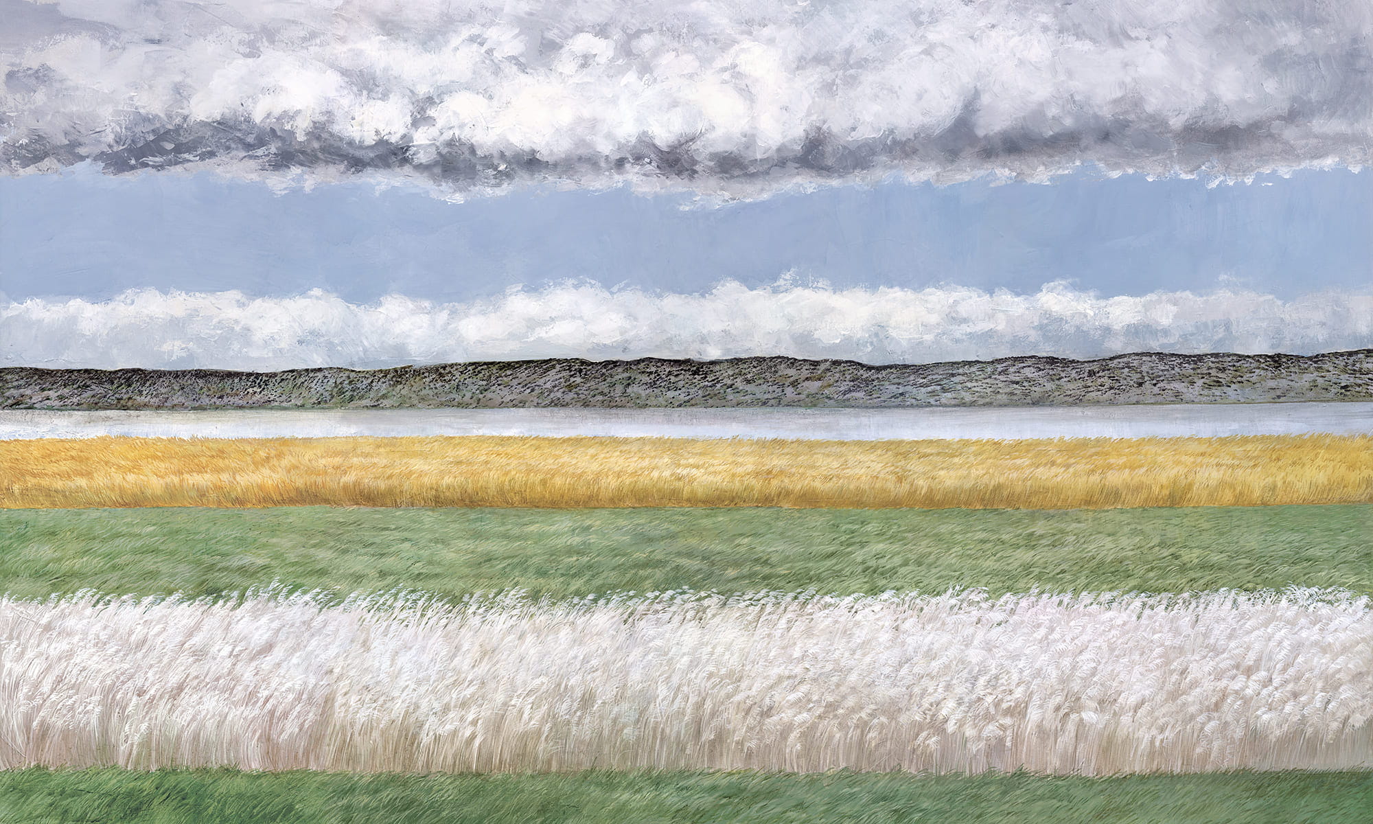 Tapeta Wonderwall Mellow to niezwykle realistyczny mural, który przedstawia malowniczy pejzaż otwartej łąki. Kompozycja składa się z pasów zielonej i złocistej trawy, białych kwiatów poruszanych wiatrem oraz spokojnej linii horyzontu pod niebem pełnym chmur. Delikatne pociągnięcia pędzla tworzą efekt malarskiej głębi, dzięki czemu ta tapeta Wonderwall doskonale sprawdzi się w aranżacjach inspirowanych naturą. To idealne rozwiązanie do wnętrz, które mają emanować spokojem i harmonią.