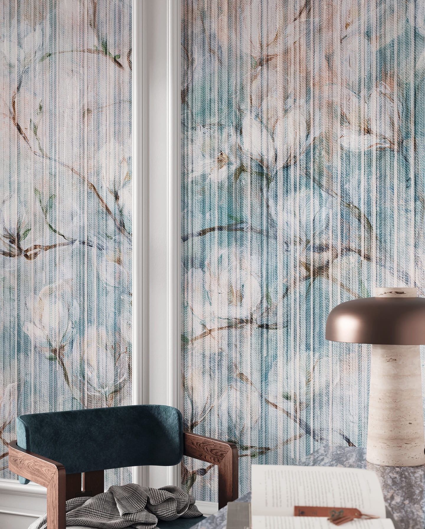 Tapeta Wonderwall Mood to delikatny mural przedstawiający kwitnące gałązki magnolii na tle miękkich, pastelowych odcieni błękitu i bieli. Efekt malarskich pociągnięć pędzla nadaje jej lekkości i sprawia, że wnętrze zyskuje subtelny, romantyczny charakter. Ta tapeta Wonderwall jest doskonałym wyborem do wnętrz, które mają emanować spokojem i harmonią. Idealnie sprawdzi się w salonie, sypialni oraz łazience, nadając pomieszczeniom eleganckiego wykończenia.