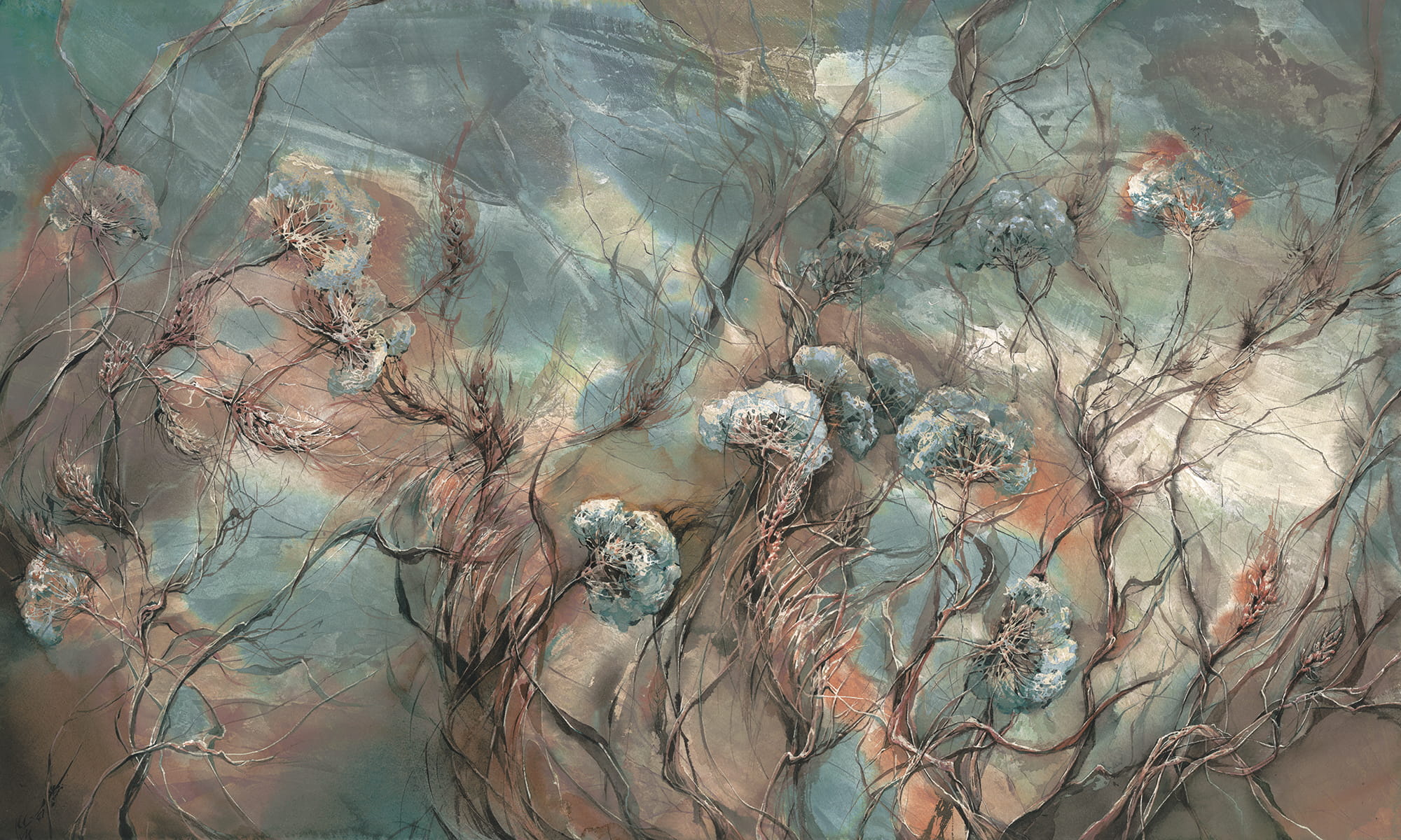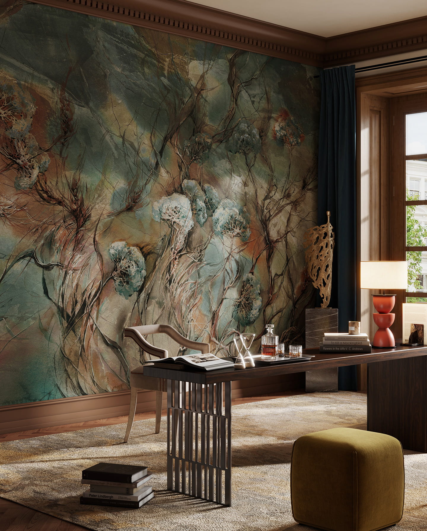 Tapeta Wonderwall Novek to wyjątkowy mural, który łączy abstrakcyjne inspiracje naturą z malarskimi efektami. Kompozycja przedstawia splątane, smagane wiatrem gałęzie oraz delikatne kwiatostany, które zdają się unosić w powietrzu. Kolorystyka utrzymana w odcieniach zieleni, brązu i turkusu tworzy efekt głębi i ruchu, nadając wnętrzu ekspresyjnego charakteru. Ta tapeta Wonderwall to idealny wybór dla osób, które szukają nietuzinkowej dekoracji ściennej o artystycznym wyrazie.