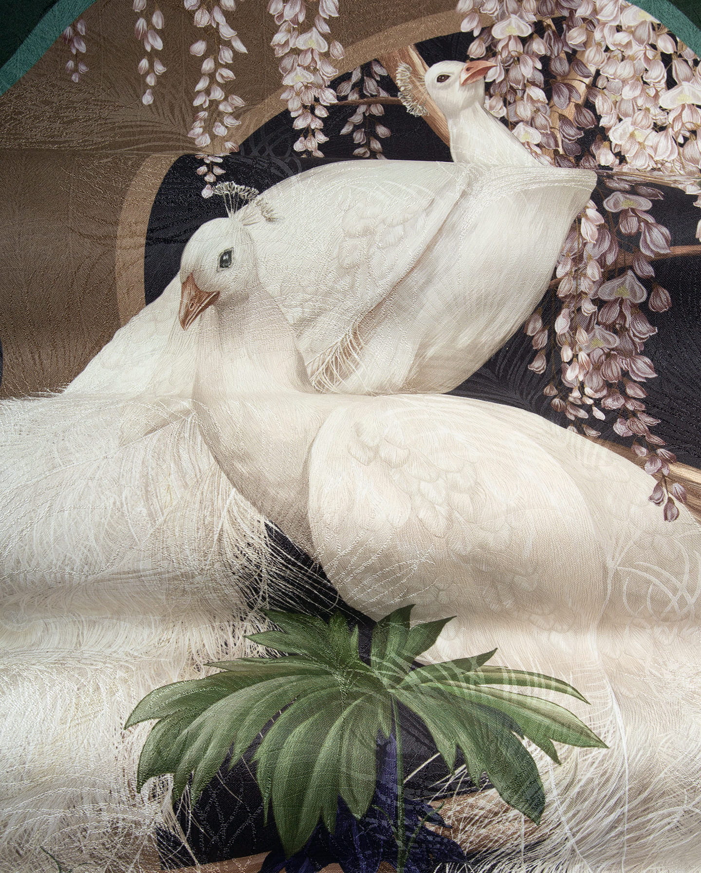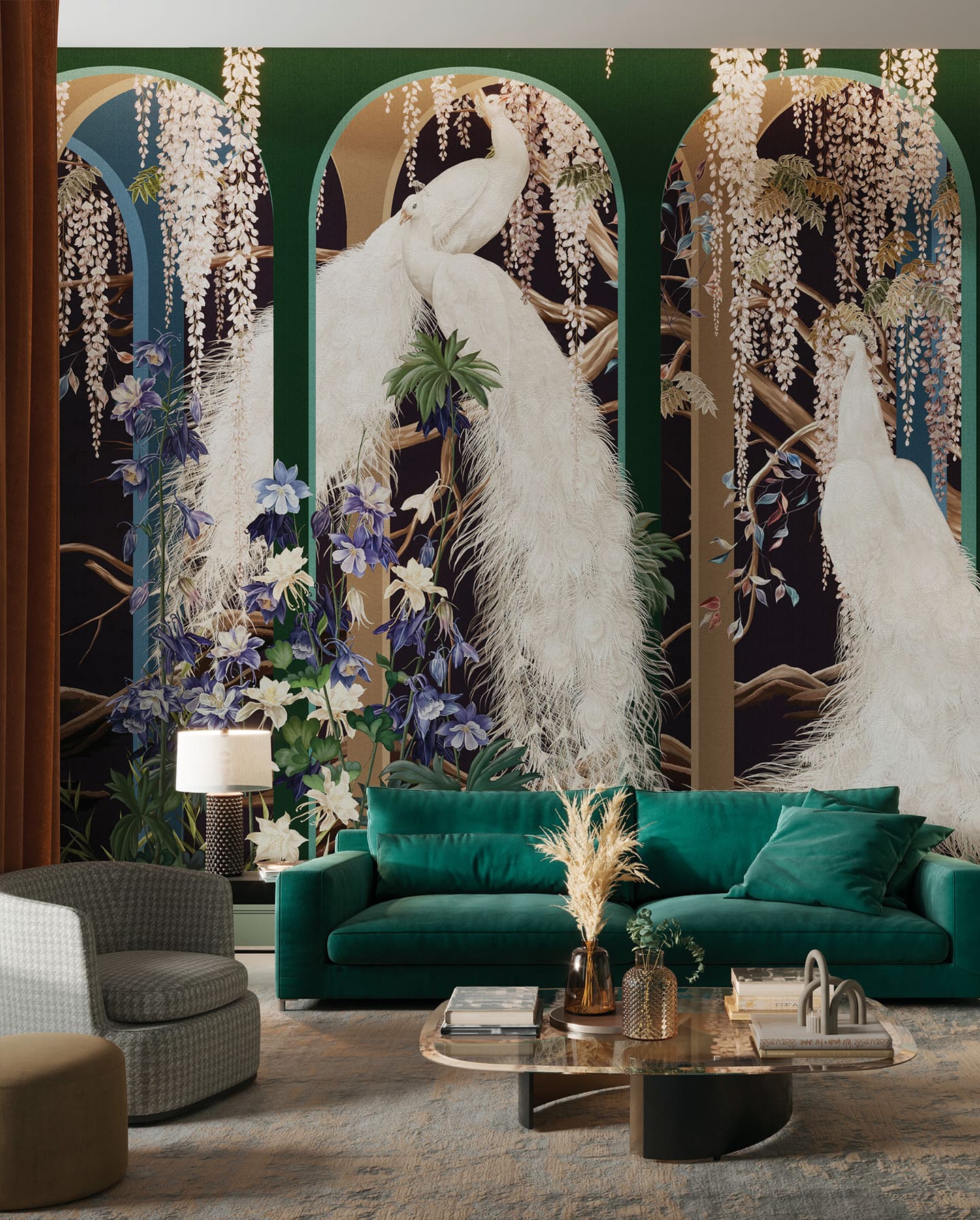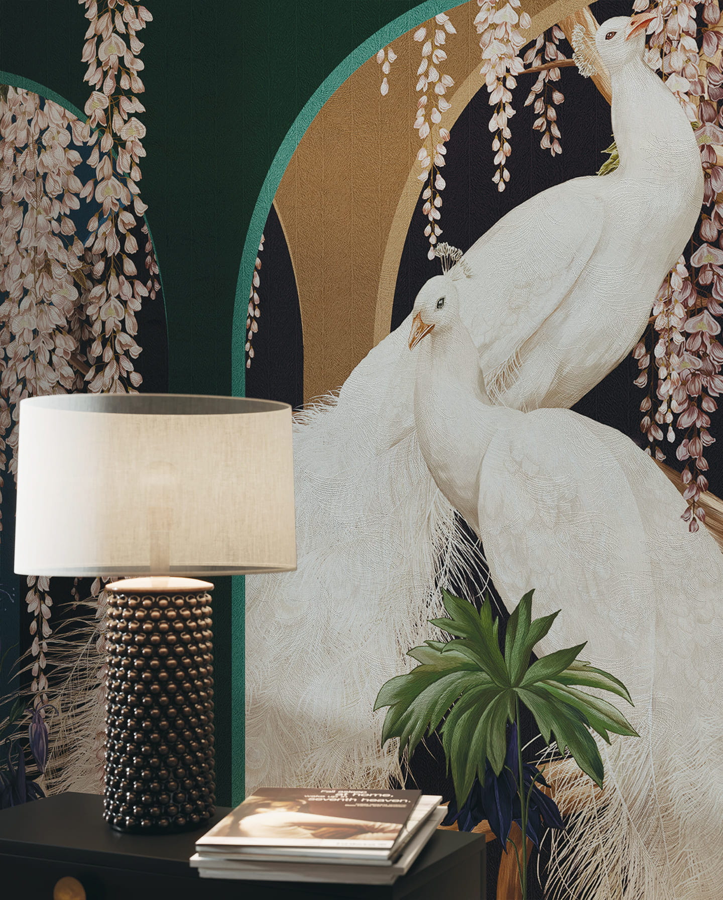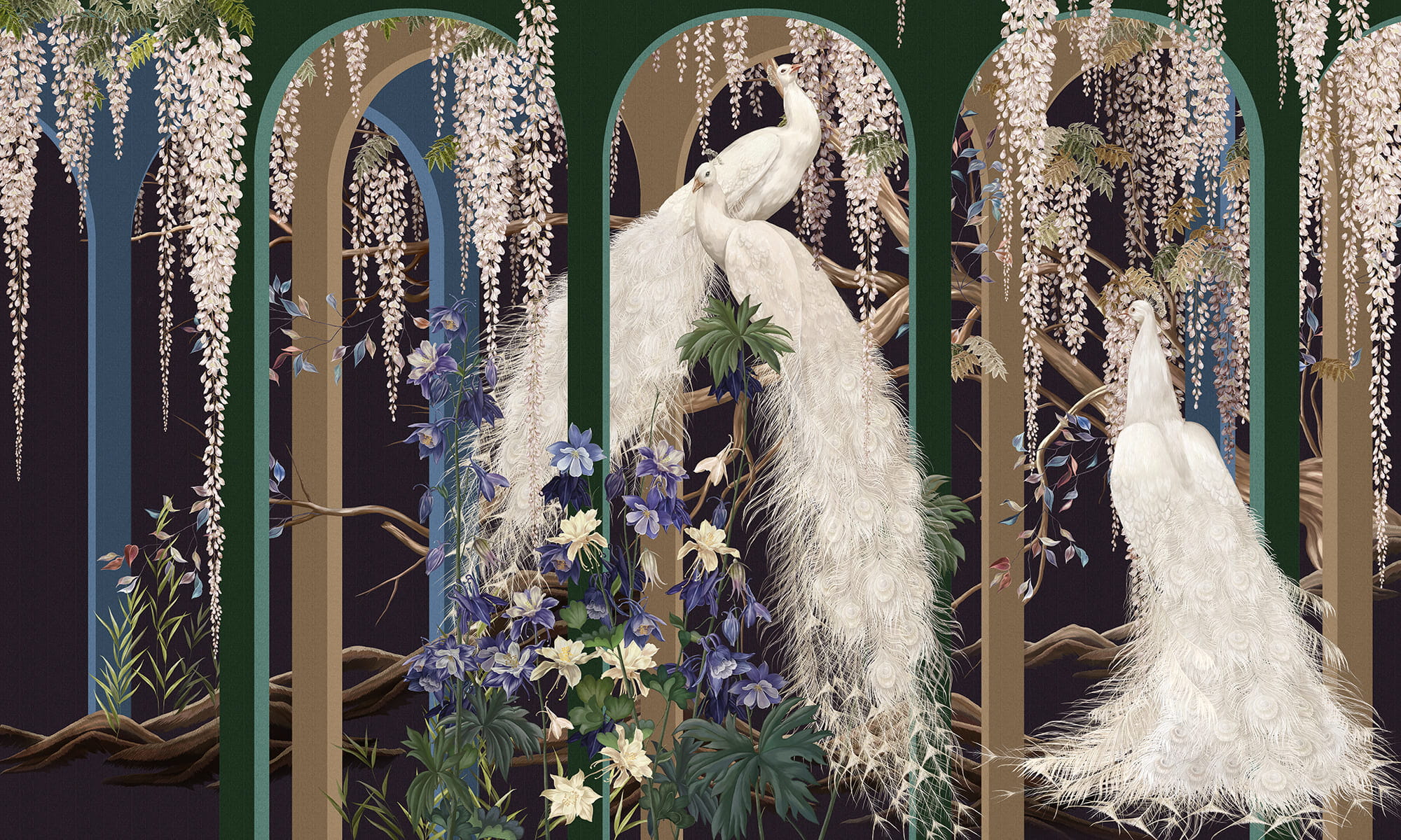Tapeta Wonderwall Verona to niezwykle dekoracyjny mural, który przenosi wnętrze w świat arystokratycznego ogrodu. Kompozycja przedstawia dwa białe pawie w otoczeniu zwisających kwiatów i klasycznych arkad, tworząc efekt trójwymiarowości i głębi. Ciemne tło kontrastuje z jasnymi detalami, podkreślając wyrafinowany styl wzoru. To tapeta Wonderwall, która nadaje wnętrzom luksusowy, elegancki charakter i przyciąga wzrok swoją wyjątkową kompozycją.